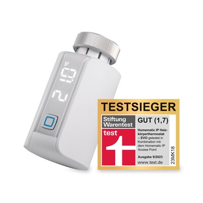 Kategorie: Zubehör für Klima & Heizen - eQ-3 - GTIN:4047976551057 - Homematic IP Heizkörperthermostat Evo Die Evolution smarten Heizens Einfach Heizkosten sparen Der designprämierteHomematic IP Heizkörperthermostat Evo(Gewinner des Red Dot Design Awards 2021)ist Teil des Homematic IP Smart-Home-Systems und hilft aktiv beim Energiesparen. Der smarte Regler ersetzt bereits bestehende Heizkörperthermostate, wodurch Energieeinsparungen von bis zu 30 % erreicht werden können. Damit Sie sich in Ihrem Zuhause wohlfühlen können, muss auch das Raumklima stimmen. Und zwar zu jeder Jahres- und Tageszeit. Herkömmliche Heizkörperthermostate sind hier keine große Hilfe. Nutzen Sie besser den smarte Heizköperthermostat Evo vonHomematic IP. Damit regeln Sie Ihr Raumklima nicht nur smart, sondern werten Ihre Räume auch optisch auf. Der Heizkörperthermostat vereint hervorragende Technik und modernes Design und all das ganz schön smart!Mit dem besonders leisen und schnellen Motor sorgen bis zu drei einstellbare Heizprofile sowie 13 möglicheänderungenpro Tag immer für das gewünschte Raumklima so kommen Sie beispielsweise morgens in ein vorgewärmtes Badezimmer, sparen bei Abwesenheit wertvolle Heizenergie und genießen den Feierabend im Wohnzimmer bei gewünschter Raumtemperatur. Der Thermostat kann ganz einfach und ohne Eingriff in das Heizungssystem am Radiator montiert werden. Die Stromversorgung übernehmen zwei AA-Batterien, welche Energie für bis zu liefern können. Im Anschluss an die ... ![]() ![]() Homematic Heizkörperthermostat - HmIP Evo eBay HmIP-eTRV-E