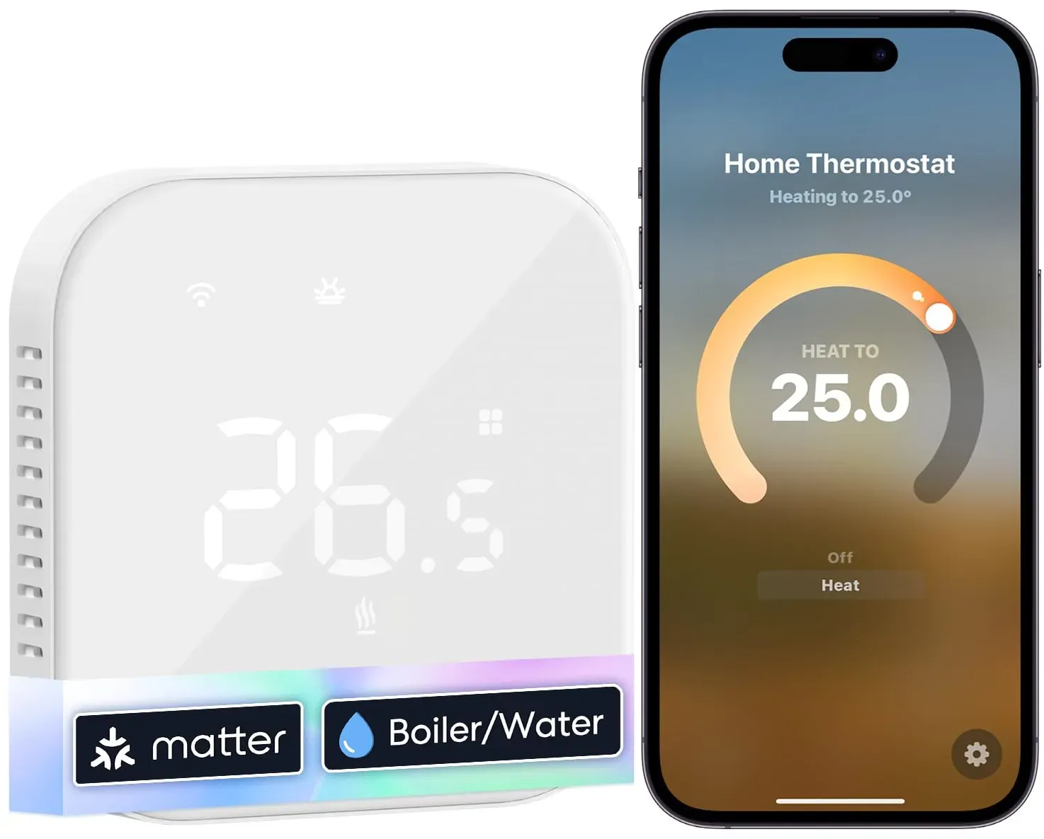 Kategorie: Zubehör für Klima & Heizen - Meross - GTIN:6942349201158 - MATTER-KOMPATIBLER HUB Mit dem Hub MSH450 unterstützt unser Heizkörperthermostat das neue Matter-Protokoll, kompatibel mit Apple HomeKit, Alexa, Google Home und mehr. Dieses intelligente Heizungsthermostat ist die zukunftssichere Lösung. SPRACH- UND APP-STEUERUNG Steuern Sie Ihr Thermostat Heizung Smart oder ein Heizkörperthermostat mit Siri, Alexa oder Google Assistant oder bequem per App. Ihr Funk Thermostat sorgt jederzeit für optimalen Komfort. ENERGIEINTELLIGENZ Die Fenster-offen-Erkennung stoppt die Heizung automatisch für 30 Minuten bei plötzlichem Temperaturabfall. So sparen Sie bis zu 30% Heizkosten im Winter mit einem modernen Heizungsthermostat oder Smart Thermostat WLAN. INDIVIDUELLE PROGRAMMIERUNG Planen Sie bis zu 6 Heizperioden täglich (5 C 35 C). Genießen Sie jederzeit angenehme Wärme im Schlafzimmer, Wohnzimmer oder Kinderzimmer dank eines intelligenten Heizkörperthermostats. EINFACHE INSTALLATION Kompatibel mit den meisten Heizkörpern dank mitgelieferter Adapter. Maße des Thermostatkopfs: M30 x 1,5 mm. Unser Heizungsthermostat funktioniert sofort nach der schnellen DIY-Installation ein zuverlässiger Heizungsregler WLAN.Das Produkt benötigt zwei AA-Batterien, die nicht im Lieferumfang enthalten sind. - 59,99 Euro bei Amazon Marketplace Home - gefunden von billiger.de Das Meross Smart Heizkörperthermostat inklusive Hub ist eine gute Wahl für HomeKit-Nutzer und bietet umfassende Sprachsteuerung. ![]() ![]() Meross Smart Heizkörperthermostat inklusive Hub, kompatibel mit HomeKit, WLAN Heizungsthermostat Kompatibel mit Siri, Alexa und Google Assistant, Fernsteuerung, M30*1,5mm, 6 Adapter