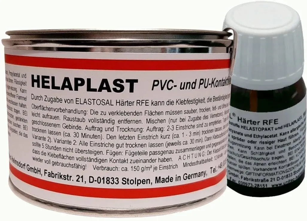 Kategorie: Klebeprodukte - unitec-helmsdorf - GTIN:4064091066600 - HELAPLAST - Plastik-Klebstoff, PVC-Klebstoff, Kontaktklebstoff, Basis: Polyurethan, transparent Kontaktklebstoff für die dauerelastische, hochfeste, ein- und zweikomponentige Verklebung von Weich-PVC, Polyurethan, verschiedenen Kunststoffe, Gummi, Metall, Gewebe, Leder, Krepp, Holz u.ä. ELASTOSAL Härter RFE - vernetzer für Zweikomponenten-Kontaktklebstoffe Hochwirksamer, sehr universell verwendbarer Vernetzer für ELASTOSAL Kontaktklebstoffe - 29,00 Euro bei Amazon Marketplace Automotive - gefunden von billiger.de ![]() ![]() BUNDLE HELAPLAST - 300g Dose eBay Transparent Kleber + ELASTOSAL HÄRTER RFE 10g Flasche