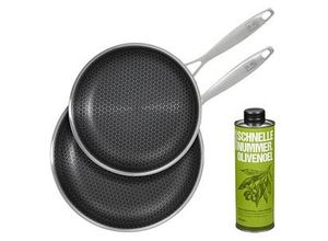 Küchenhelfer Wohnen Küchenutensilien - - HENSSLERS Pfannen-Set: wird höchsten professionellen Ansprüchen gerechtHENSSLERS Pfannen-Set besteht aus je einer Pfanne mit den Maßen 28 cm und 24 cm Durchmesser und einer Flasche Olivenöl mit 500 ml Inhalt. Hochwertiges Material für exzellente KochergebnisseDie beiden HENSSLERS Pfannen bestechen durch ihr 3-Schicht-Material, das aus Edelstahl und Aluminium besteht. Diese Kombination sorgt für eine gleichmäßige Wärmeverteilung und hervorragende Kochergebnisse. Die innovative Wabenstruktur der Pfannenoberfläche minimiert das Anhaften von Speisen und ermöglicht ein gleichmäßiges Garen.Vielseitig einsetzbar auf allen HerdartenDieses Pfannen-Set ist für alle gängigen Herdarten geeignet, einschließlich Induktionsherde. Die robuste Bauweise erlaubt zudem den Einsatz im Backofen bis zu einer Temperatur von 230 Grad. Egal ob Fleisch, Fisch oder Gemüse - alles wird perfekt gebraten. Da das Native Olivenöl in Extra Qualität bereits im Set enthalten ist, können Sie auch sofort loslegen.Modernes Design und Langlebigkeit vereintDas ansprechende Design von HENSSLERS Pfannen mit der charakteristischen Wabenstruktur fügt sich nahtlos in jede moderne Küche ein. Der ergonomische Edelstahlgriff mit Henssler Gravur bietet eine komfortable Handhabung. Die kratzfeste Oberfläche und die hochwertige Verarbeitung ren eine langanhaltende Nutzung.HENSSLERS Pfannen-Set mit den zwei hochwertigen Pfannen und dem Olivenöl ist Ihre ideale Wahl für müheloses ... ![]() ![]() Pfannen-Set HENSSLERS, silber (edelstahlfarben), B:29cm L:50cm Ø:28cm, Pfannen, 3-Schicht Material, Wabenstruktur und Antihaftbeschichtung, Induktion