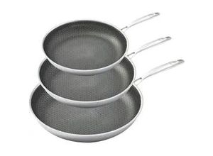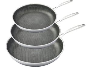 Küchenutensilien Wohnen - - Hensslers Pfannen-Set 3tlg. ist der Allrounder zum Braten und Kochen von Fleisch, Fisch und Gemüse. Das Set besteht aus den Edelstahl-Pfannen in den Größen 20 cm, 24 cm und 28 cm. Hensslers Pfannen sind zum Braten und Kochen und für alle Herdarten einschließlich Induktionsherd, Gas- und Elektroherd sowie Keramikherd bestens geeignet. Selbst für den Backofen ist Steffens Bratpfanne bis 230 Grad hitzebeständig und backofenfest. Mit Hensslers Pfannen wird durch die gleichmäßige und lange Wärmeverteilung jedes Gericht, egal ob Fleisch, Fisch oder Gemüse, auf den Punkt genau gebraten bzw. gegart. Das Mehrschichtmaterial und die innovative Wabenstruktur sind das Herzstück von Steffens Pfanne. Die Wabenstruktur unterstützt die gleichmäßige Verteilung und reguliert die Zufuhr über die gesamte Pfannenfläche, ohne dass zu bratende Zutaten anhaften und verbrennen. Besonders hervorstechend im Design ist die innovative Wabenstruktur, die nicht nur funktional einen extremen Härtegrad liefert, ohne zu zerkratzen, sondern auch besonders modern aussieht. Die Härte von rostfreiem Edelstahl und das Mehrschichtsystem unterstützen die hohe Langlebigkeit der Pfannen und Töpfe zusätzlich. Intensiver Gebrauch ist Euch durch den Aufbau und die qualitative Verarbeitung über lange Zeit rt möglich. Mit einfachen, leckeren und schnellen Gerichten ('5 Zutaten in 15 Minuten, Rest kommt aus der Vorratskammer') hat Steffen Henssler mit der 'SCHNELLEN NUMMER†seit 2008 ein ... ![]() Pfannen-Set HENSSLERS, silber (edelstahlfarben), B:29cm L:50cm Ø:28cm, Pfannen, 3-Schicht Material, Wabenstruktur und Antihaftbeschichtung, Induktion