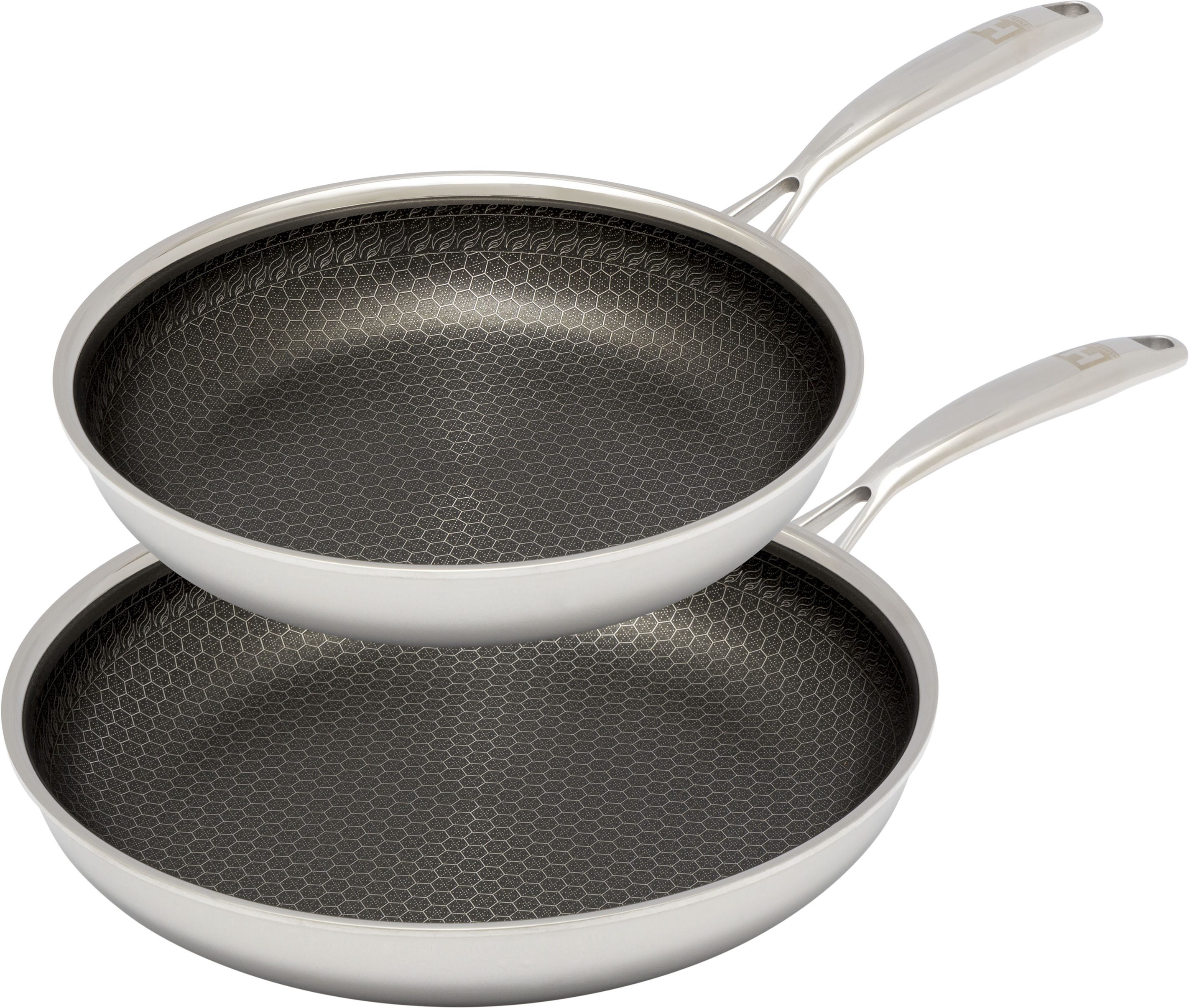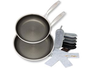 Küchenutensilien Wohnen - - Bestseller. Hensslers Pfannen-Set 2tlg. ist der Allrounder zum Braten und Kochen von Fleisch, Fisch und Gemüse. Das Set besteht aus den Edelstahl-Pfannen in den Größen 24cm und 28cm. Hensslers Pfannen sind zum Braten und Kochen und für alle Herdarten einschließlich Induktionsherd, Gas- und Elektroherd sowie Keramikherd bestens geeignet. Selbst für den Backofen ist Steffens Bratpfanne bis 230 Grad hitzebeständig und backofenfest. Mit Hensslers Pfannen wird durch die gleichmäßige und lange Wärmeverteilung jedes Gericht, egal ob Fleisch, Fisch oder Gemüse, auf den Punkt genau gebraten bzw. gegart. Das Mehrschichtmaterial und die innovative Wabenstruktur sind das Herzstück von Steffens Pfanne. Die Wabenstruktur unterstützt die gleichmäßige Verteilung und reguliert die Zufuhr über die gesamte Pfannenfläche, ohne dass zu bratende Zutaten anhaften und verbrennen. Besonders hervorstechend im Design ist die innovative Wabenstruktur, die nicht nur funktional einen Härtegrad liefert, ohne zu zerkratzen, sondern auch besonders modern aussieht. Die Härte von rostfreiem Edelstahl und das Mehrschichtsystem unterstützen die hohe Langlebigkeit der Pfannen und Töpfe zusätzlich. Intensiver Gebrauch ist Euch durch den Aufbau und die qualitative Verarbeitung über lange Zeit rt möglich., Material: Material Pfanne: Edelstahl, Materialeigenschaften Pfanne: antihaftbeschichtet, Material Beschichtung: Antihaft-Beschichtung, Material Griffe: Edelstahl, Produktdetails: ... ![]() Pfannen-Set HENSSLERS, silber (edelstahlfarben), Ø:28cm, Pfannen, 3-Schicht Material, Wabenstruktur und Antihaftbeschichtung, Induktion, Topseller