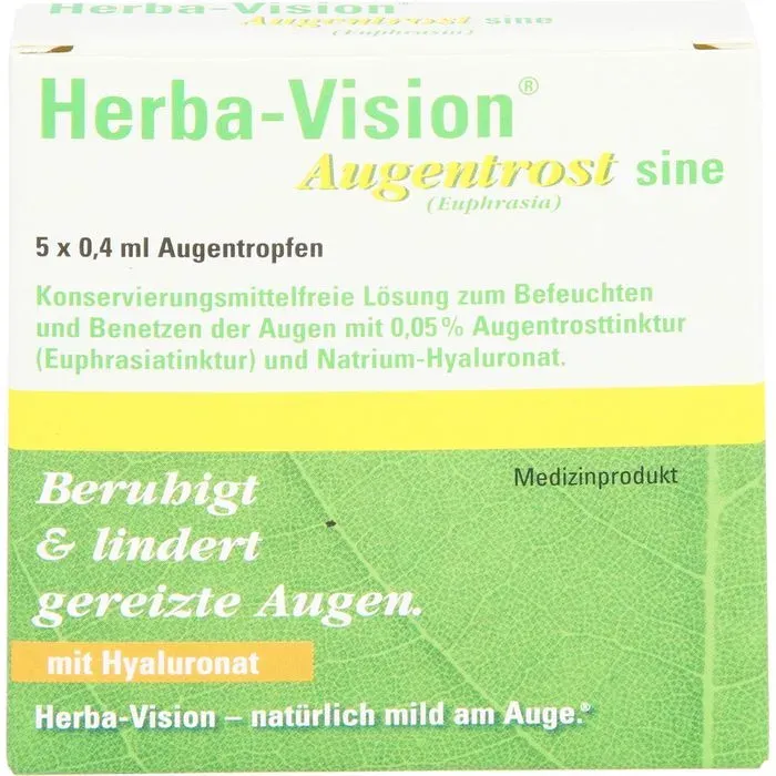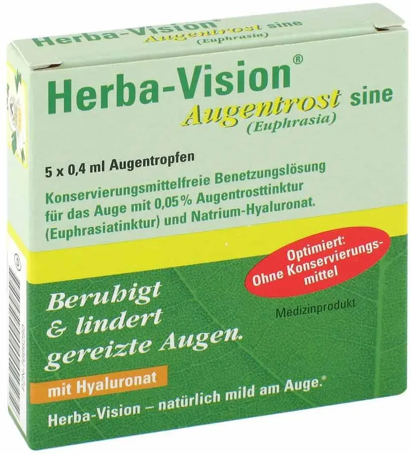 Zusammenfassung für die Kaufentscheidung: | Merkmal | Herba-Vision Augentrost (15 ml) | Herba-Vision Augentrost MD sine (10 ml) | |--------------------------|---------------------------------|--------------------------------------------------| | Konservierungsmittel | Ja | Nein (konservierungsmittelfrei) | | Phosphatfrei | Nein | Ja | | Anwendung mit Kontaktlinsen | Ja | Ja | | Verpackung | Tropfflasche | SafeDrop® Mehrdosenbehälter | | Preis (ca.) | 9,50 € | ca. 9-12 € | | Beliebtheit | Sehr gut, besonders bei trockenen Augen | Sehr gut, besonders für empfindliche Augen | Wenn Sie empfindliche Augen haben oder die Tropfen während des Tragens von Kontaktlinsen verwenden möchten, ist die MD sine Variante empfehlenswert. Für eine klassische Anwendung ist die 15-ml-Variante ausreichend. Für die Suche und den Kauf können Sie die Produktnamen direkt im Meta-Preisvergleich verwenden, z.B. Herba-Vision Augentrost oder Herba-Vision Augentrost MD sine. Jetzt live Suche nach herba vision augentrost starten! Herba vision augentrost Angebote aus dem beliebtesten Preisbereich*Durch Käufe über Links zu Händlern kann diese Website eine Provision erhalten, u.a. durch das eBay Partner Network und das AmazonPartnerNet![]() ![]() OmniVision HERBA-VISION Augentrost sine Augentropfen 2 ml