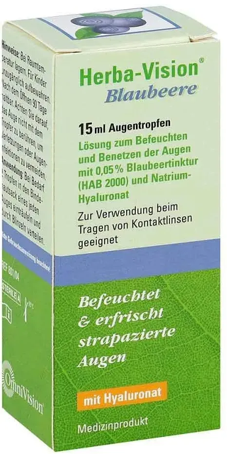 Kategorie: Tee - OmniVision - hochwertige medizinische Augenpflege zur Befeuchtung von trockenen Augen Lösung zum Eintropfen in das Auge Medizinprodukt aus der Apotheke (PZN: 03114023) Hersteller: OmniVision GmbH, Deutschland (Originalprodukt aus Deutschland) - 7,55 Euro bei Amazon Marketplace Health & Personal Care - gefunden von billiger.de ![]() ![]() HERBA-VISION Blaubeere - Augentropfen 15 eBay ml PZN03114023