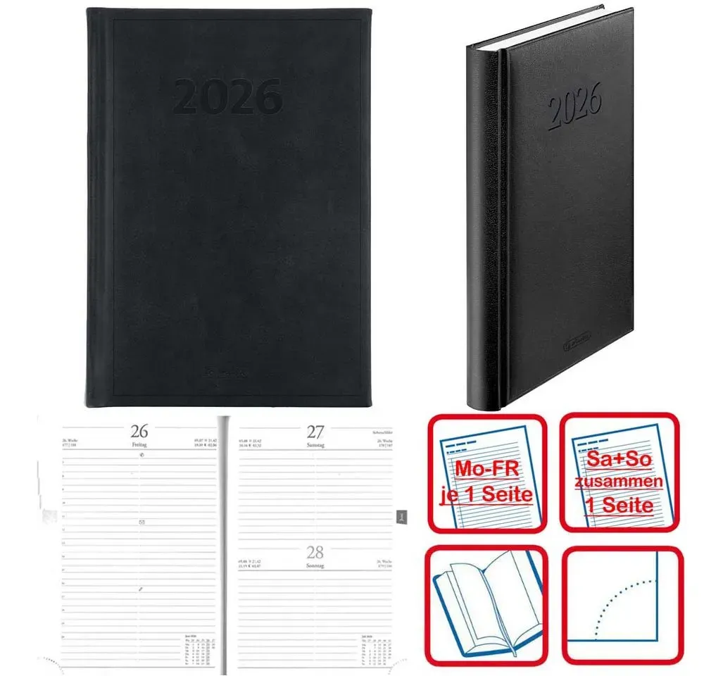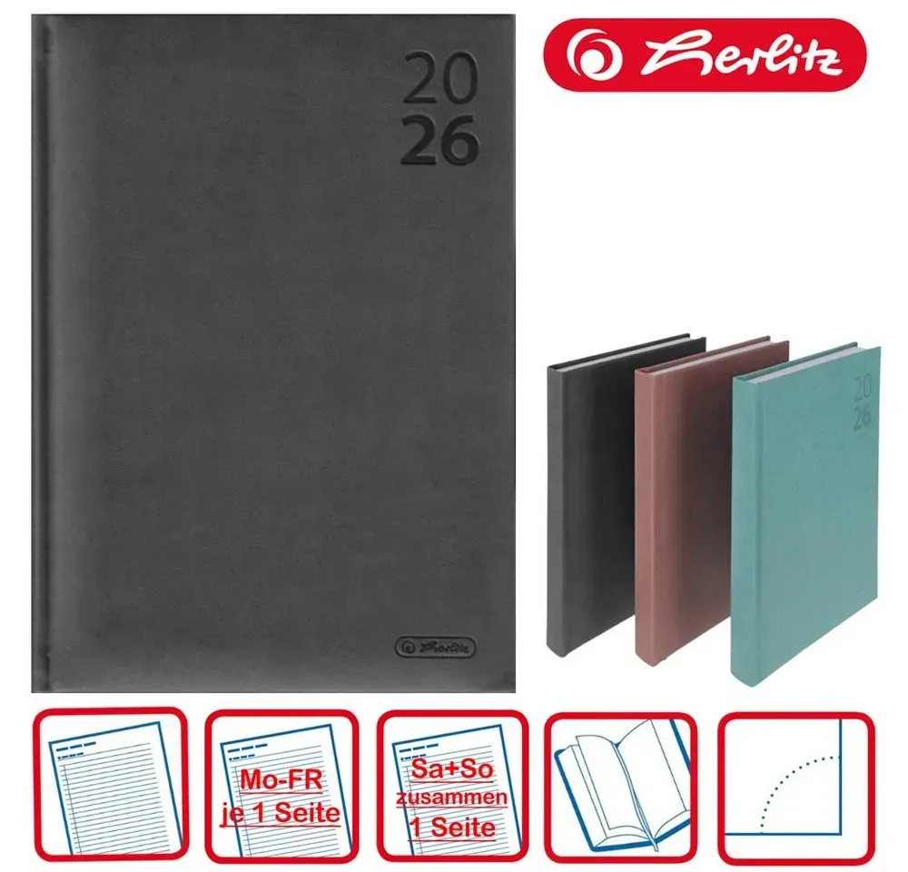 Kategorie: Organizer - Herlitz - GTIN:4008110431253 - TAGESPLANER: A5-Format mit einem Tag pro Seite (Samstag/Sonntag gemeinsam), 352 Seiten für detaillierte Tagesplanung PRAKTISCHE AUSSTATTUNG: Ausgestattet mit Leseband, Eckperforation und Monatstaben für schnelle Navigation HOCHWERTIGER EINBAND: Wattierter Balacron-Hardcover-Einband in Blau mit anthrazitfarbenem Innendruck ZUSATZINHALTE: Umfangreicher redaktioneller Teil mit nützlichen Informationen und Planungshilfen üBERSICHTLICHES DESIGN: Einsprachiges deutsches Kalendarium für optimale Lesbarkeit und professionelle Terminplanung - 6,49 Euro bei Amazon Marketplace Automotive - gefunden von billiger.de Ein solider schwarzer Cheftimer mit 352 Seiten, der viel Platz für tägliche Notizen bietet. ![]() ![]() Herlitz Buchkalender Cheftimer A5 2026, Schwarz, 352 Seiten, 1 Tag = 1 Seite, Deutsch, Wattierter Einband