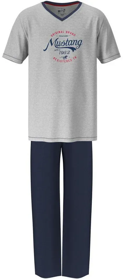 lieferbar-in 4-5 Werktagen bei dirMUSTANG Schlafanzug Pyjama-Set T-Shirt Long Pants lange Hose Schlafkombi Nachtwäsche (2 tlg) Oberteil graumelange, Pants navy grau L (52/54)