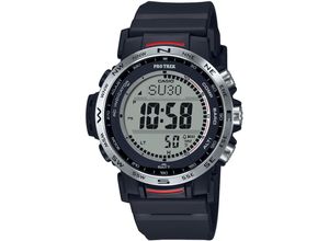 Kategorie: Chronographen - Casio - GTIN:4549526102547 - Full-Auto-LED Light Um die Hintergrundbeleuchtung der Uhr zu aktivieren, genügt eine leichte Drehung des Handgelenks. Das funktioniert, sobald die Helligkeit in der Umgebung nachlässt. Stoßfestigkeit Casio Uhren mit stoßfester Konstruktion (G-Shock Uhren, Baby-G Uhren, G-ms Uhren) können auch bei Aktivitäten mit starken Vibrationen sowie sportlichen Aktivitäten mit intensiver Beanspruchung (Motorcross, Wintersport, Skateboarden ) getragen werden. Solarfunktion Unabhängig und umweltfreundlich sorgt eine Solarzelle für die Energieversorgung Ihrer Uhr. überschüssige Solarenergie wird in einem Akku gespeichert. Funksignalempfang (EU, USA, Japan, China) Ob in Europa, Nordamerika und Japan oder in weiten Teilen Kanadas, Mittelamerikas und Chinas - nachdem die Uhr auf die örtliche Zeitzone eingestellt ist, empfängt sie das entsprechende Funksignal und zeigt immer die exakte Zeit an. In vielen Ländern stellt sie außerdem ganz eigenständig die Sommer- und Winterzeit ein. Weltzeit Die Weltzeit zeigt die Uhrzeiten in bis zu 29 verschiedenen Zeitzonen an. Stoppfunktion (1/100 - 1STD) Abgelaufene Zeit, Zwischenzeit und Endzeit werden mit einer Genauigkeit von Hundertstelsekunden gemessen. Die Messkapazität der Uhr reicht bis zu einer Stunde. Timer - 1/1 Sek. - 100 Min. Der Nullzählalarm (Timer) gibt nach Ablauf einer eingestellten Zeit ein Signal ab. Die Messkapazität der Uhr reicht bis zu 100 Minuten und kann im Sekunden Takt ... Dieser Casio Pro Trek Funkchronograph ist eine gute Wahl für Outdoor-Enthusiasten mit Funk- und Solarfunktion. ![]() Funkchronograph CASIO PRO TREK, schwarz (schwarz, grau), Armbanduhren, Herren, Quarzuhr, Armbanduhr, Herrenuhr, Funk, Solar, Stoppfunktion, Weltzeit