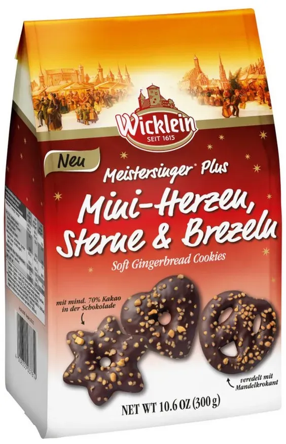 3 Händlerangebote bei billiger.de - Kategorie: Kekse & Gebäck - WEISS - Zutaten Zutaten , WEIZENMEHL, Glukose-Fruktose-Sirup, Zucker, Kakaobutter, VOLLMILCHPULVER, SüßMOLKENPULVER, Kakaomasse, Karamellzuckersirup, Gewürze (enthält Zimt), Backtriebmittel: Kaliumcarbonate, Diphosphate, Natriumcarbonate; Sonnenblumenöl, MAGERMILCHPULVER, BUTTERREINFETT, Feuchthaltemittel: Glycerin, Sorbit; Säuerungsmittel: Citronensäure; Emulgator: SOJA-LECITHINE; Salz. KANN SCHALENFRüCHTE, ERDNüSSE, EI, LUPINE, SESAM ENTHALTEN., Hinweise Aufbewahrungshinweise , Kühl und trocken., Artikelbezeichnung Bezeichnung des Lebensmittels , Weiss Herzen Sterne Brezeln Lebkuchen mit Vollmilchschokolade 500g, - GTIN:4003160288208 Wicklein ist eine bekannte Marke für Lebkuchen und dieses Produkt bietet eine Mischung aus Mini-Herzen, Sternen und Brezeln mit Krokant. ![]() ![]() Gottfried Wicklein GmbH & Co. KG Wicklein Süßigkeit, Wicklein Meistersinger PLUS Mini Herzen Sterne Brezeln ZB Krokant 300g