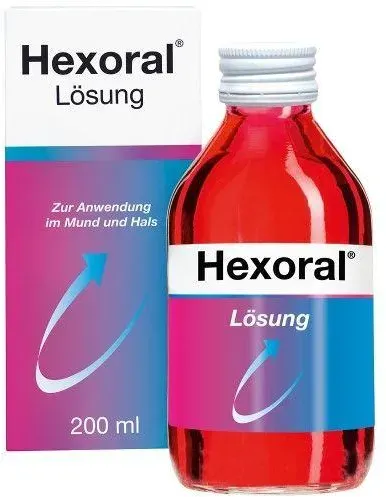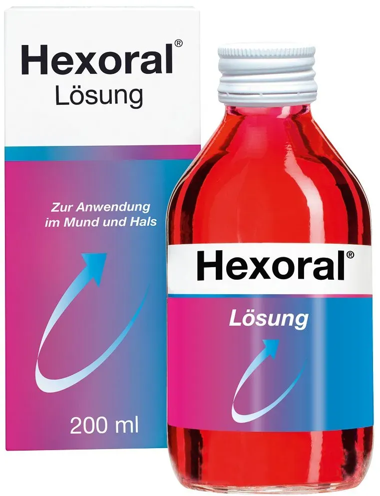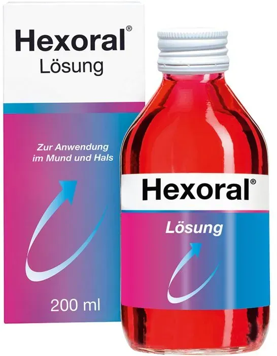 3.77 / 100 ml - Hexoral - Anwendungsgebiet von Hexoral Lösung bei EntzündungenHexoral Lösung bei Entzündungen dient zur vorübergehenden Keimzahlverminderung im Mund- und Rachenraum und zur vorübergehenden unterstützenden Behandlung bei bakteriell bedingten Entzündungen des Zahnfleisches (ergänzend zur mechanischen Reinigung) und der Mundschleimhaut sowie nach parodontalchirurgischen Eingriffen bei Kindern ab 2 J., Jugendlichen und Erwachsenen.Wirkstoffe / Inhaltsstoffe / ZutatenHexetidin, gereinigtes Wasser, Ethanol 96% (V/V),Polysorbat 80,Citronensäure monohydrat,Saccharin natrium,Levomenthol,Azorubin,Natriumcalciumedetat,Natronlauge zur pH-Wert-Einstellung,Eucalyptusöl.GegenanzeigenBei bekannter überempfindlichkeit gegenüber einem der oben genannten Inhaltsstoffe sollte dieses Produkt nicht angewendet werden.DosierungBei Erkrankungen in der Mundhöhle ca. 30 Sekunden lang mit 10 bis 15 ml unverdünnter Lösung spülen.Bei Erkrankungen im Rachenraum mit 10 bis 15 ml 30 Sekunden gurgeln.Soweit nicht anders verordnet, sollte die Anwendung zweimal täglich, am besten morgens und abends nach den Mahlzeiten erfolgen. EinnahmeDas Arzneimittel wird stets unverdünnt angewendet. Soweit nicht anders verordnet, wird das Arzneimittel morgens und abends nach den Mahlzeiten angewendet.Das Präparat ist nur zur Anwendung im Mund- und Rachenbereich geeignet und darf nicht geschluckt werden. Deshalb darf das Arzneimittel nur dann angewendet werden, wenn der Patient in der Lage ist, die Lösung ... ![]() ![]() kenvue HEXORAL 0,1% Lösung 200 ml