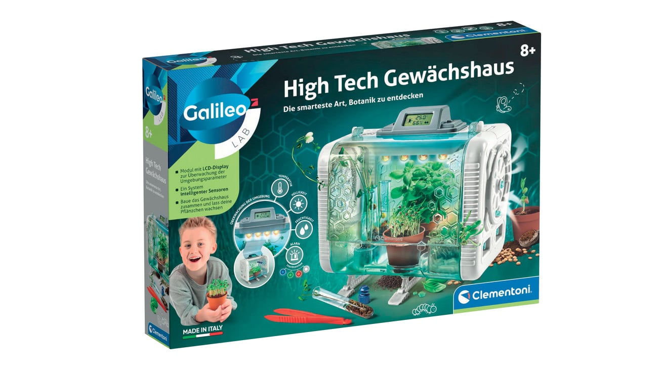 Zustand: Neu - Experimentierkästen - Clementoni CLEMENTONI - 52818 - EAN: 8005125528189 - Ein Gewächshaus für botanische Experimente, um die Umgebung zu überwachen, in der Pflanzen für ein optimales Wachstum wachsen. Das Gewächshaus ist mit RGB-LED-Leuchten ausgestattet, die je nach Helligkeit der Stimmung eingestellt werden können, und einem elektronischen Modul mit LCD-Display zur Steuerung der Temperatur und Luftfeuchtigkeit im Gewächshaus. Experimentieren Sie damit verschiedene Arten der Kultur - das Pflanzen in Töpfen mit Erde, im Reagenzglas mit Baumwolle und Gel (mit Agar-Agar). - Verkäufer: Ponera im amazon.de Marketplace ![]() ![]() Galileo High - Tech Gewächshaus