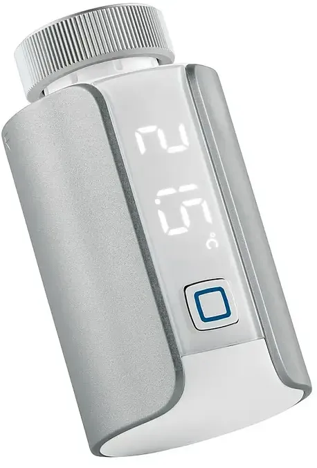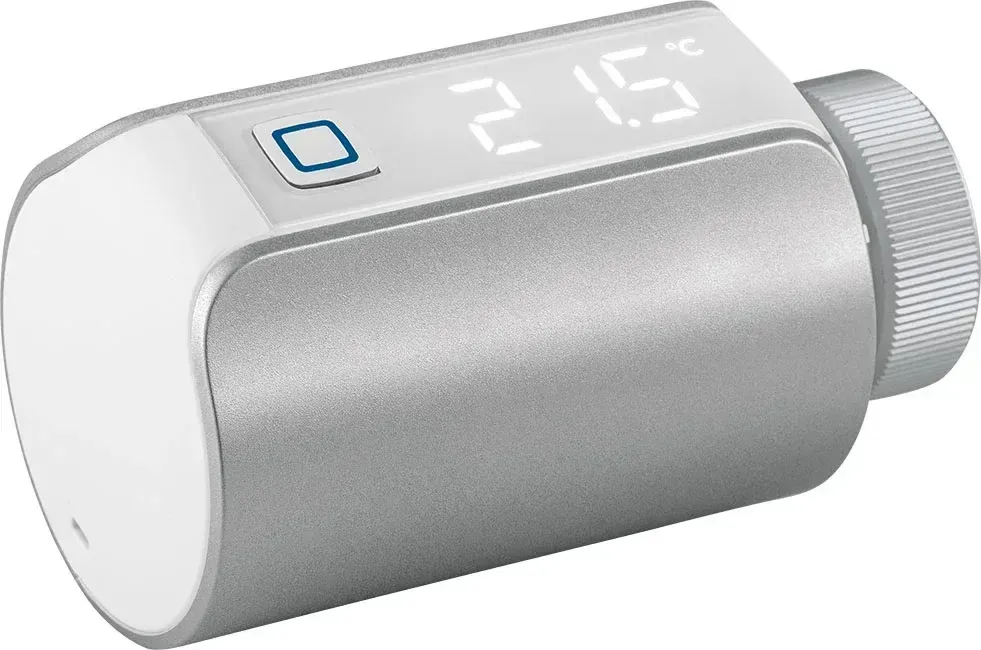 HOMEMATIC IP - EAN: 4047976566501 - Homematic IP Heizkörperthermostat - Evo, silber überlassen Sie das Heizen einem Profi: Der Homematic IP Heizkörperthermostat - Evo in der Farbe Silber vereint smarte Technik und modernes Design. Dadurch sorgt er rund um die Uhr für das optimale Raumklima und ist ein Eyecatcher in Ihrem Smart Home. Der Heizkörperthermostat - Evo mit silbernem Gehäusedesign fügt sich mit der reduzierten und eleganten Form ideal in Ihr Wohnumfeld ein. Dabei wurde auch das Bedienkonzept im Design neu durchdacht: Durch eine leichte Drehung des Thermostats nach rechts oder links, regeln Sie die Temperatur direkt am Gerät und lesen diese ganz einfach auf der weiß hinterleuchteten LED-Anzeige ab, die bei der Bedienung automatisch aufleuchtet. Mit bis zu drei einstellbaren Heizprofilen und 13 änderungen am Tag sorgt der präzise und schnelle Motor immer für das optimale Raumklima. So betreten Sie bereits morgens ein wohlig warmes Badezimmer und wenn Sie über Tag nicht zu Hause sind, wird nicht unnötig geheizt. Die Einstellungen nehmen Sie wie gewünscht vor: Direkt am Gerät, komfortabel per Sprachsteuerung (Amazon Alexa oder Google Assistant) oder jederzeit flexibel von unterwegs per Homematic IP App. Aber nicht nur das: Messreihen vom Fraunhofer Institut haben bestätigt, dass mit dem Homematic IP Heizkörperthermostat - Evo ein dynamisch-adaptiver Abgleich an den einzelnen Heizkörpern automatisch durchgeführt wird - vergleichbar mit dem hydraulischen Abgleich. So ... ![]() Homematic IP Funk Heizkörperthermostat Evo - HmIP-eTRV-E-S