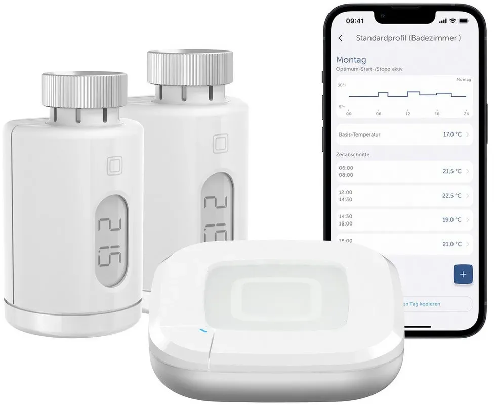 Homematic IP - EAN: 4047976621651 - Der einfache Einstieg in ein smartes Zuhause: Mit dem Starter Set Heizen pure von Homematic IP können durch individuelle Heizprofile und die Vernetzung mit Fensterkontakten bis zu 33 % wertvoller Energie beim Heizen gespart werden. Das reduziert die Heizkosten, senkt den CO2-Ausstoß und sorgt zudem für ein angenehmes Raumklima. Das E-Paper-Display des Heizkörperthermostats ermöglicht ein Ablesen der Temperatur und lässt sich flexibel an die Montageausrichtung anpassen. Individuelle Temperaturverläufe können einfach per App erstellt werden mit bis zu 3 einstellbaren Heizprofilen und 13 änderungen pro Tag. So wird nur geheizt, wenn Wärme benötigt wird. Und während des Lüftens wird die Raumtemperatur automatisch mithilfe der Fenster-auf-Erkennung abgesenkt. über Kühlprofile lässt sich im Sommer alternativ eine indirekte Kühlung via Wärmepumpe realisieren. Die Steuerung der Raumtemperatur erfolgt nach den individuellen Bedürfnissen des Anwenders: einfach per App, egal ob Zuhause oder unterwegs, direkt am Gerät per Drehrad oder ganz komfortabel per Sprachsteuerung (über Alexa oder Google Assistant). - bei alternate.de - aus Yadore Produktdaten ![]() ![]()