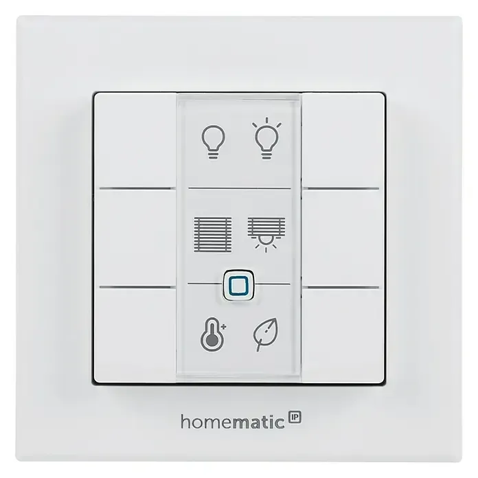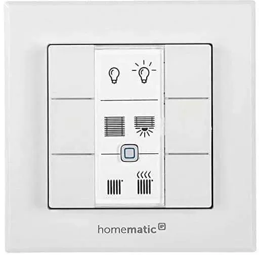 Zustand: Gebraucht - Funk-Wandsender - Homematic IP eQ-3 - HmIP-WRC6 142308A0 - EAN: 4047976423088 - Für den Betrieb ist der Homematic IP Access Point in Verbindung mit der App (Cloud-Service), die Smart Home Zentrale CCU3 oder eine geeignete Partnerlösung notwendig. Universell einsetzbarer Funk-Wandtaster mit sechs Tasten zur komfortablen Steuerung von angelernten Geräten. Die Tasten können paarweise oder einzeln frei konfiguriert werden. Ermöglicht bspw. das Ein- oder Ausschalten von Lichtquellen und Szenarien. Individuelle Tastenbeschriftung über austauschbares Beschriftungsfeld. Einfache Integration in bestehende Schalterserien für 55er-Rahmen der führenden Hersteller. - 5 Händler im amazon.de Marketplace Dieses Angebot von Smartkram ist eines der günstigsten für den weißen Wandtaster und bietet ein gutes Preis-Leistungs-Verhältnis. ![]() ![]() eQ-3 Homematic IP Smart Home Wandtaster 6-fach, HmIP-WRC6