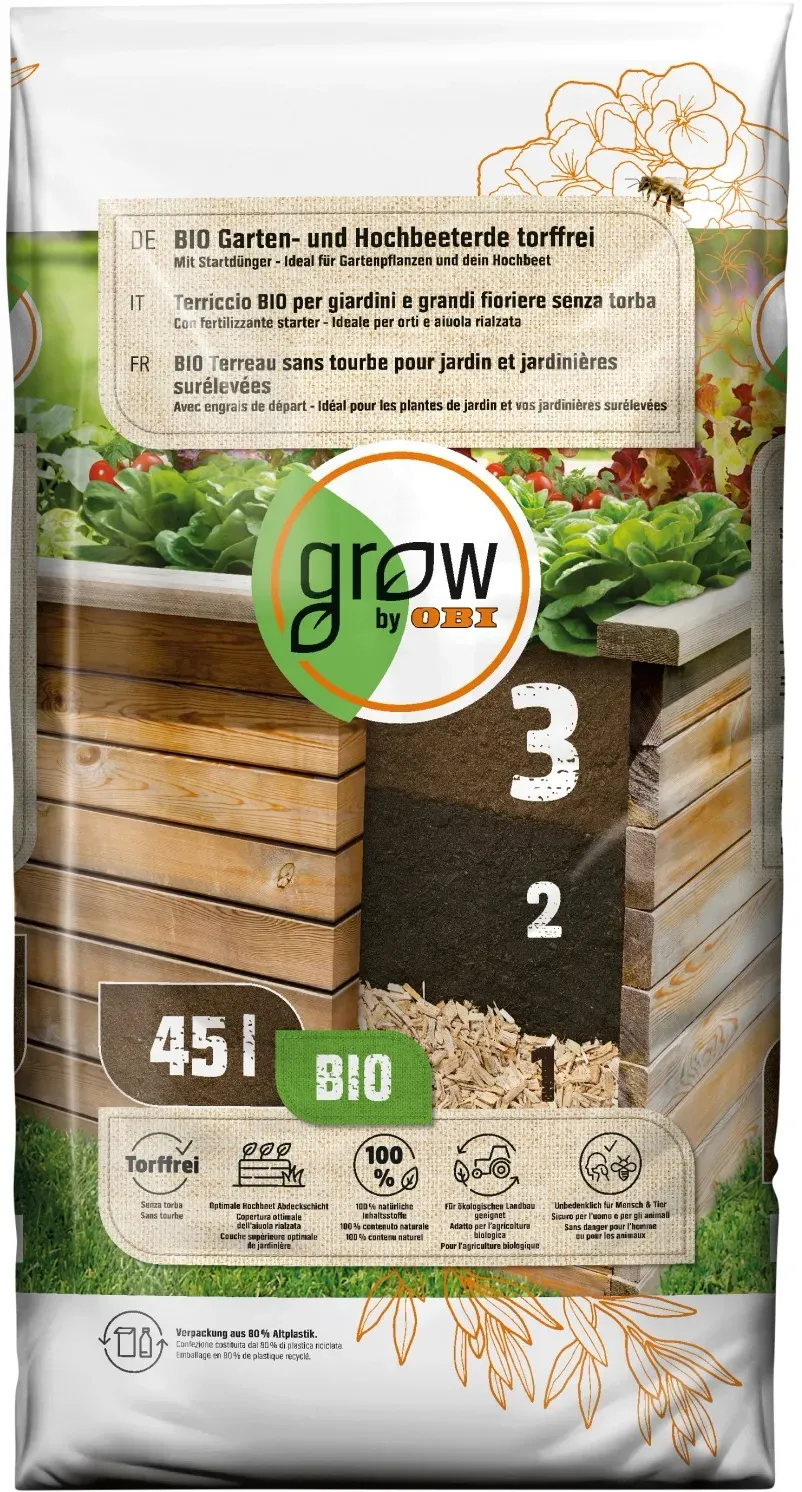 0.19 /l - Kategorie: Blumenerde - grow by obi - GTIN:4007167362848 - Die torffreie GROW by OBI Bio Garten- und Hochbeeterde ist eine hochwertige Bio-Pflanzerde, die für kraftvolles und gesundes Wachstum bei Gartenpflanzen und im Hochbeet sorgt. Nährstoffe für Ihre Pflanzen Die mit Naturdüngern gebrauchsfertig aufgedüngte Pflanzenerde ist bestens geeignet und besteht aus einer Mischung, die die Aktivität der Bodenorganismen fördert. Daher dient die Erde als perfekte Abdeckschicht für ein gesundes Wachstum von Kräuter-, Gemüse- und Tomatenpflanzen in Ihrem Hochbeet. Zudem ist die GROW by OBI Bio Garten- und Hochbeeterde optimal zur dauerhaften Pflanzung von Gartenblumen, Stauden, Rosen und Gehölzen im Garten oder in Pflanzgefäßen geeignet. Anwendungsempfehlung im Hochbeet Die GROW by OBI Bio Garten- und Hochbeeterde wird als oberste Lage im Hochbeet eingebracht. Hierfür schichten Sie eine etwa 20 cm - 25 cm dicke Erdschicht auf die zwei unteren Schichten auf. Für die unterste Schicht empfiehlt es sich, GROW by OBI Bio Holzhäcksel und für die mittlere Schicht GROW by OBI Bio Hochbeetkompost zu verwenden. Die Erde sollte vorher etwas aufgelockert werden, um Klumpenbildung zu vermeiden. Bei der Befüllung des Hochbeets gilt allgemein, dass das verwendete Material von der untersten Schicht zur obersten Schicht immer feiner werden sollte. Abschließend setzen Sie die gewünschten Pflanzen im Abstand von ca. 30 cm in die Hochbeeterde ein, drücken diese an und wässern sie abschließend ... Stabilo GiRo Premium Hochbeet- & Gewächshauserde bietet eine hochwertige Mischung für anspruchsvolle Gärtner. ![]() Manomano.d e