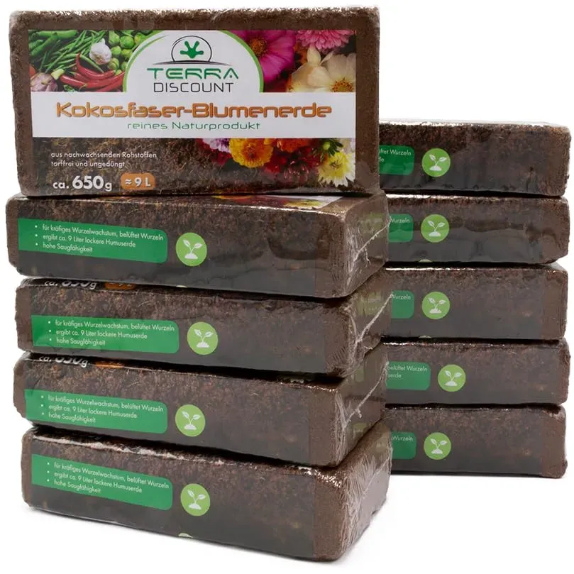 Kategorie: Blumenerde - Jasker's - GTIN:4260624379326 - PFLANZEN-BOOSTER: Unsere Bio Hochbeet-Erde 40l mit Dünger ist die perfekte Stärkung für kräftige Pflanzen & eignet sich für das Bepflanzen von Hochbeeten, Pflanzenkübeln, im Garten oder Gewächshäusern SICHTBARE LANGZEITWIRKUNG: Durch ausgewählte Inhaltsstoff-Kombinationen werden die Pflanzen sichtbar gestärkt und profitieren darüber hinaus auch langfristig von der wirksamen Nährstoffzufuhr. Damit ist die Hochbeeterde für Gemüse, Kräuter und Blumen geeignet, quasi eine Universal-Erde EINFACHE & ZEITSPARENDE ANWENDUNG: Die Bio Erde etwas auflockern, das Hochbeet befüllen (letzte Schicht), die Pflanze einsetzen & anschließend mit der restlichen Erde auffüllen, leicht andrücken & gießen IN DEUTSCHLAND ABGEFüLLT: Unsere Bio Hochbeet Erde ist torffrei und wird ausschließlich in Deutschland abgefüllt. Die Bioerde ist mit den wichtigsten Nährstoffen angereichert. Perfekt für das bestmögliche Wachstum von Tomaten, Gurken, Gemüsepflanzen, Kräuter und Blumen im Hochbeet. JASKERS PREMIUM BLUMENERDE HOCHBEET: Selbstverständlich verwenden wir nur hochwertigste Inhaltsstoffe für unsere Bio Erde Hochbeet und testen diese gründlich, um die beste Qualität zu gewährleisten - 19,99 Euro bei Amazon Marketplace Lawn & Garden - gefunden von billiger.de Terra Discount Kokosfaserhumus ist eine torffreie und ungedüngte Alternative, die sich ideal als Basis oder zur Auflockerung eignet. ![]() ![]() Terra Discount Kokosfaserhumus *Blumenerde* 10x ca.650g (ergibt ca. 90 Liter), Kokoserde als Hochbeeterde und für Pflanzen/Zimmerpflanzen, aus nachwachsenden Rohstoffen, torffrei und ungedüngt