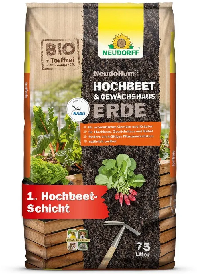 0.86 / l - Kategorie: Blumenerde - Compo - GTIN:4008398186388 - Hochwertige, torffreie Bio-Spezialerde, Ideal als obere Schicht im Mini-Hochbeet, Für eine schmackhafte und ertragreiche Ernte Nährstoffversorgung für bis zu 5 Wochen dank besonders hohem Humusanteil und ergiebigem Naturdünger-Mix, Für besonders platzsparendes Gärtnern im Mini-Hochbeet Einfache Anwendung: Blumenerde vor der Anwendung auflockern und mögliche Klumpen lösen, Leichtes Andrücken der umliegenden Erde, Formung eines Gießrandes und ausgiebige Wässerung der Pflanzen 100 % natürliche und nachwachsende Inhaltsstoffe ohne Torf, Gemäß EU-Verordnung 2018/848 für den ökologischen Landbau geeignet Lieferumfang: 1 x COMPO BIO Mini-Hochbeeterde, 20 L - 17,29 Euro bei Amazon Marketplace Lawn & Garden - gefunden von billiger.de NEUDORFF NeudoHum HochbeetErde ist eine etablierte torffreie Bio-Erde, die für ihre Qualität bekannt ist. ![]() ![]() NEUDORFF NeudoHum HochbeetErde 75 l