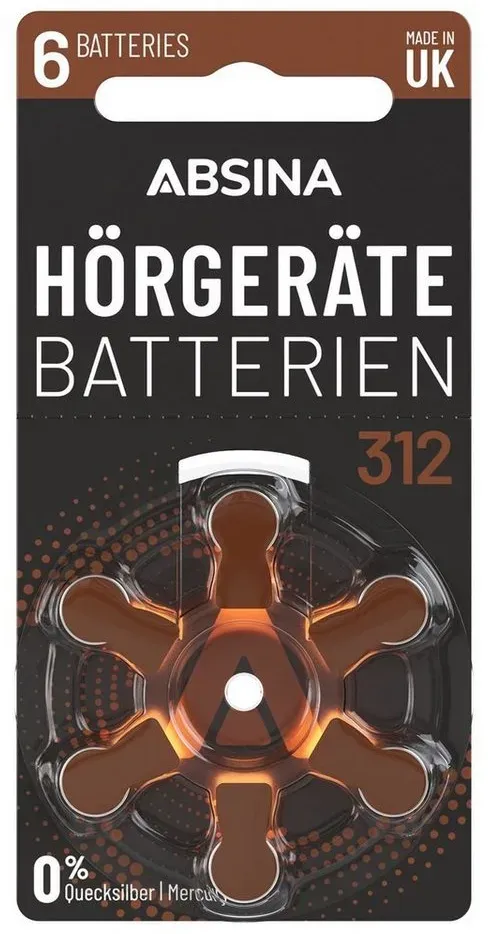 Kategorie: Batterien & Akkus - Absina - GTIN:4260368687718 - Stromversorgung Anzahl Batterien , 6 St., - 10,99 Euro bei OTTO - gefunden von billiger.de ![]() ![]() Hearing360 40 Hörgerätebatterien Größe 312 Premium Qualität (5 Blistercard a 8 Batterien)