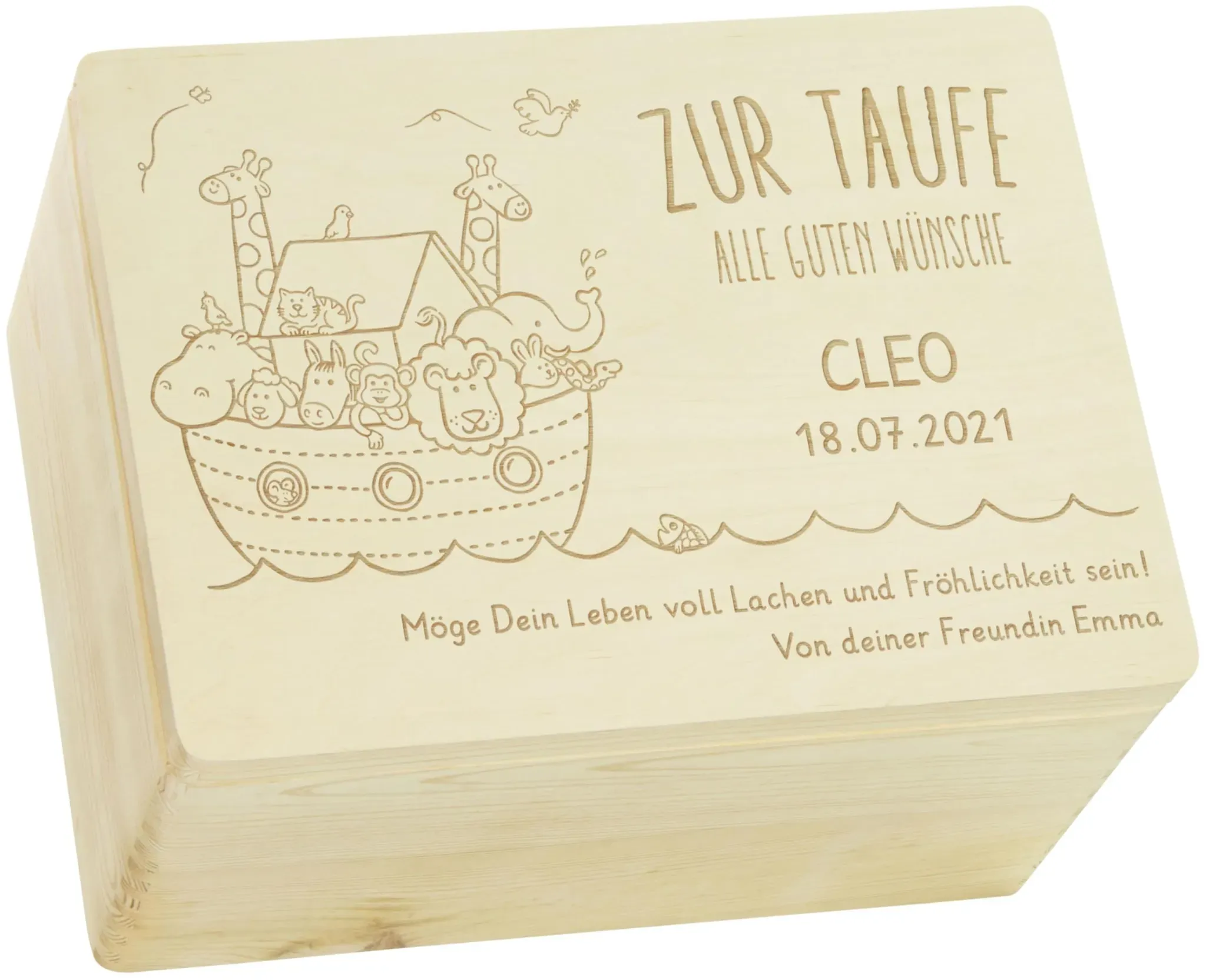 Zustand: Neu - Boxen & Kästen Dekorative Boxen & Kästen - Creative Deco - JAN-CD-SD240b-KEY - EAN: 5061028583659 - PERFEKTE GRÖSSE - Mit den Außenmaßen von 40 x 30 x 24 cm und Innenmaßen von 37,5 x 27,5 x 19,8 cm ist diese unbehandelte Natur Rechteckig Allzweck-Kiste Erinnerungskiste Geschenkbox perfekt zur Aufbewahrung von Foto, Dokumenten, Wertsachen, Spielzeugen, Hochzeit Geschenke und Karten, Werkzeugen geeignet. EUROPÄISCHES KIEFERN- & SPERRHOLZ - Leichtes Produkt mit einer Wandstärke von 1cm + 3mm Sperrholz-Boden. Der Holzgeruch, der in der Verpackung enthalten ist, wirkt wie ein erfrischender Gedanke, dass Sie natürliches, zertifiziertes Holz verwenden. HOHE QUALITÄT - Das Kiefernholz Holzkästchen stammt aus den nachhaltigen Wäldern der Karpaten, von welchen bekannt ist, dass dort das höchste Niveau des Holzes in der Welt zu bekommen ist, deswegen sind unsere Behälter so beliebt von den Kunden. Sie können diese im Garten, Wohnzimmer, in der Küche u.v.m. nutzen. Auch als Fotoboxen, Fotoaufbewahrungsboxen, Fotobox, Spielkiste, Dekobox, Geschenkboxen, Geschenkkarton, Bastelkiste, Karton, Sortierbox Holz, Sortierkasten verwendbar. PRÄZISER SCHNITT - Durch die abgerundeten Kanten ist das Gestalten der Aufbewahrungsbox mit Deckel für alle Altersgruppen geeignet! Perfekt gedacht zum Beizen, Bemalen, Lackieren, Pyrographie, DIY, Handwerk und für andere Deko-Projekte! Auch als Schuhputzkasten, Schatztruhe, Schatzkiste, Schachtel, Geschenkkiste, Weinkisten, Kartoffelkiste, ... Diese personalisierbare Erinnerungsbox ist ein wunderschönes Taufgeschenk und bietet Platz für besondere Andenken. ![]() ![]() LAUBLUST Erinnerungsbox Taufe - Arche Noah - Personalisiertes Taufgeschenk - Holzkiste ca. 40 x 30 x 24 cm, Natur, FSC