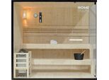 Kategorie: Saunen - Home Deluxe - GTIN:4058166243560 - * Maße (B x H x T): 200 x 190 x 150 cm * Hochwertiges Fichtenholz in Natur home-deluxe-gmbh. * Farbe: Schwarz * Ideal für bis zu 5 Personen * Komplette Glasfront aus Sicherheitsglas (ESG) * 8 kW Saunaofen * Inklusive komplettem Zubehör, Vollausstattung home-deluxe-gmbh. Die Kombination aus modernem Design und hochwertigen Materialien verleiht dieser Sauna einen zeitlosen Look, der sich nahtlos in jedes Interieur einfügt. Der Korpus der SHADOW besteht aus robustem Fichtenholz, das für seine Festigkeit und Langlebigkeit bekannt ist. Der angenehme Duft nach Tanne trägt zur entspannten Atmosphäre in der Sauna bei. Die Panoramaglasfront besteht aus stabilem, 8 mm dickem ESG-Sicherheitsglas, das für Sicherheit und Langlebigkeit sorgt. Das Herzstück der Sauna ist der leistungsstarke 8 kW Markenofen, der mit Saunasteinen ausgestattet ist, um ein authentisches Saunaerlebnis zu bieten. Das mitgelieferte Zubehör umfasst ein exklusives Sauna-Set mit Kelch, Kelle, Sanduhr, Thermometer und Saunasteinen sowie eine Lampe für eine angenehme Beleuchtung und ein entspanntes Ambiente. Mit Platz für bis zu 5 Personen ist die Shadow XL ideal für gesellige Saunagänge mit Familie und Freunden. ! * Nicht spiegelverkehrt aufbaubar home-deluxe-gmbh. * Pflegeleichte Oberfläche * Einfache und schnelle Montage * Temperaturbereich von max. 80 - 100°C * Wandaufbau der Seitenwände in Sandwichbauweise: Massive Holzpaneele innen und außen mit ... ![]() ![]() HOME DELUXE Sauna SHADOW - XL, BxTxH: 200 x 150 x 190 cm, 44 mm, (inkl. 8 kW Saunaofen, Saunasteine & komplettem Zubehör) für 5 Personen, Fichtenholz, Traditionelle Sauna schwarz