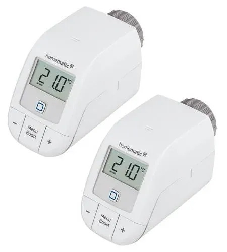 Homematic IP - Automatische und komfortable Steuerung der Raumtemperatur durch bedarfsgerechtes HeizenDer Homematic IP Heizkörperthermostat basic ist Teil des Homematic IP Smart-Home-Systems und hilft aktiv beim Energiesparen. Der smarte Regler ersetzt konventionelle Heizkörperthermostate, wodurch Energieeinsparungen von bis zu 30 % erreicht werden können.Der Thermostat wird ohne Eingriff in das Heizungssystem und ohne Werkzeug am Heizkörper montiert. Die Stromversorgung übernehmen zwei AA-Batterien, welche Energie für ca. liefern können. Der Heizkörperthermostat ist dank voreingestelltem Heizprofil sofort einsatzfähig dieses lässt sich bei Bedarf jederzeit manuell anpassen. Pro Tag sind individuelle Temperaturverläufe mit bis zu 13 änderungen möglich. So heizt Homematic IP bestimmte Räume nur dann, wenn wirklich Bedarf besteht.Die Einrichtung kann flexibel am Gerät selbst, per Homematic IP App (in Verbindung mit dem Homematic IP Access Point) oder über eine browserbasierte Oberfläche (in Verbindung mit einer Zentrale CCU3) vorgenommen werden. Alternativ kann der smarte Thermostat auch ohne Zentrale betrieben werden: Der Stand-alone-Betrieb (Push-to-Pair) ermöglicht das direkte Anlernen von bis zu acht Fenster- und Türkontakten mit Magnet (HmIP-SWDM) zum automatischen Absenken der Raumtemperatur beim Lüften.über die App lässt sich der Heizkörperthermostat in ein umfassendes Smart-Home-System integrieren. Die Cloud-Lösung ermöglicht zum Beispiel die Einstellung der ... ![]() ![]() HOMEMATIC IP - Smart Home eBay 153412A0, Heizkörperthermostat Basic, 2 Stück
