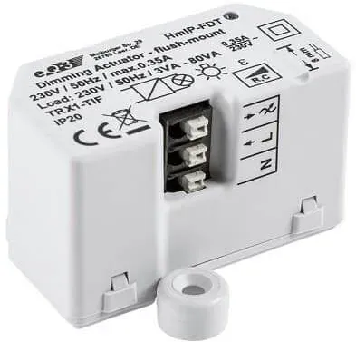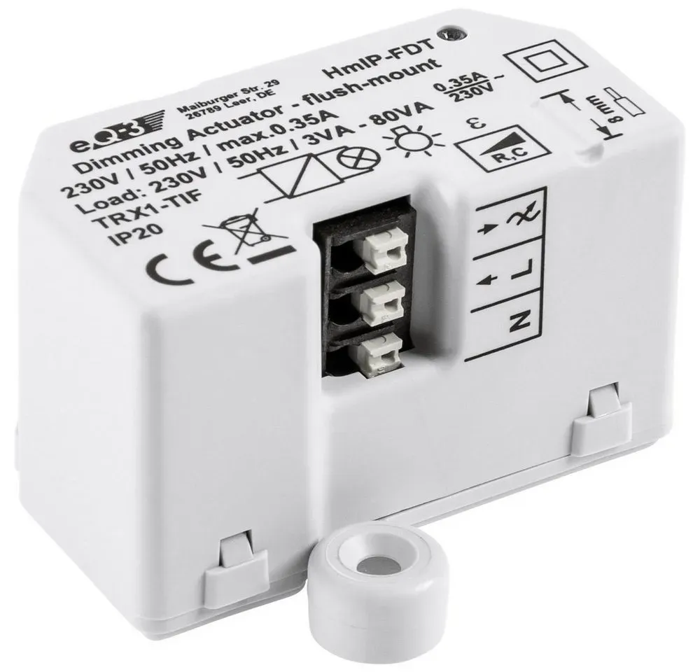 Haus- und Sicherheitstechnik Home-Automation Smart Home Homematic IP Heimautomatisierung - EAN:4047976506095 - Homematic IP Smart Home Dimmaktor Unterputz - PhasenabschnittDer Homematic IP Dimmaktor Unterputz ist Teil des Homematic IP Smart-Home-Systems und kann zum Ein- bzw. Ausschalten sowie zum Dimmen von Leuchten eingesetzt werden. Der Dimmaktor ist kompakt gebaut, sodass er bequem in Standard-Unterputz- oder auch Aufputzdosen Platz findet. Bereits bestehende Lichtsysteme können so durch die Nutzung vorhandener Kabel mit wenigen Handgriffen modernisiert und zukünftig per Funk über eine Fernbedienung, einen Wandtaster oder die kostenlose Smartphone-App gesteuert werden. Da es sich bei dem Aktor um einen Phasenabschnittsdimmer handelt, eignet sich dieser für klassische Glühlampen, Halogenlampen, für dimmbare Energiesparlampen wie auch für die meisten dimmbaren LED-Lampen. Der vollelektronische Phasenabschnittsdimmer wurde hierbei besonders für energiesparende Leuchtmittel optimiert, deren Schaltleistung zwischen 3 und 80 VA liegt. Die moderne Elektronik macht einen Betrieb ohne jegliche Geräuschentwicklung möglich. Wurde der Dimmer in ein Homematic IP System integriert, kann die Lichtleistung bequem in 0,5-%-Schritten gedimmt werden.Optimiert für moderne Leuchtmittel und damit besonders geeignet für kleine Lasten (z. B. LED)Moderner, vollelektronischer Phasenabschnittdimmer für besonders leisen Betrieb ohne Geräuschentwicklung (im Vergleich zu älteren Dimmern)Über die ... Dieser Dimmaktor für Markenschalter zu 59.95 Euro ermöglicht die Nutzung bestehender Schalterrahmen. Reichelt.d e HOMEMATIC IP HMIP BDT - Dimmaktor für Markenschalter