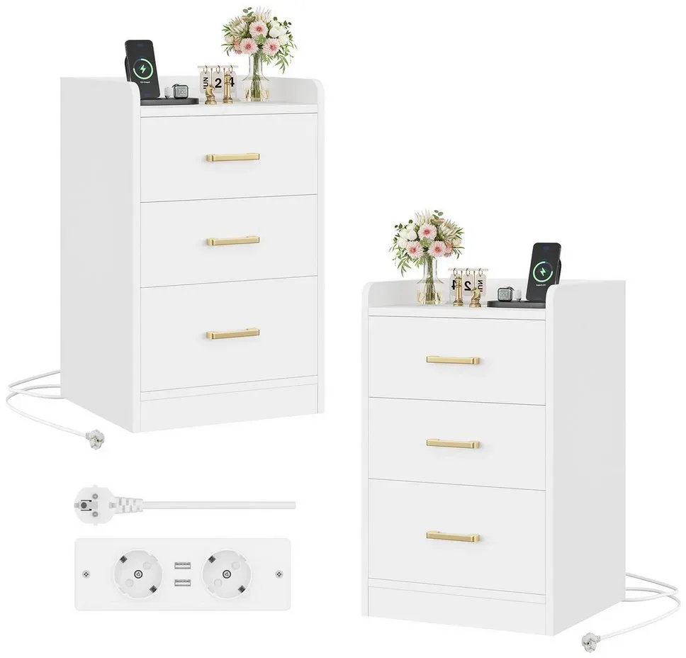lieferbar-in 6-8 Werktagen bei dirHomfa Nachttisch Nachtschrank mit Ladefunktion (2-St), 3 Schubladen, 2 AC-Steckdosen, 2 USB-Anschlüsse, 40x38x66cm weiß