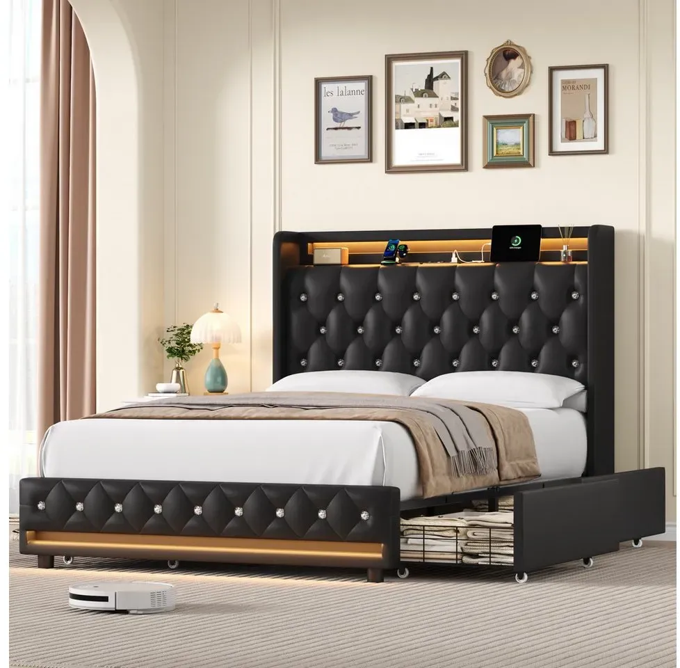 lieferbar-in 9-11 Werktagen bei dirHomfa Polsterbett 140x200 Bett Doppelbett Bettgestell, mit Ladefunktion und 4 Schubladen, LED-Beleuchtung, ohne Matratze schwarz