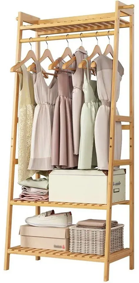 lieferbar-in 7-9 Werktagen bei dirHomfa Kleiderständer, Bambus 3 Ablagen 2 Haken 164x70x42cm beige