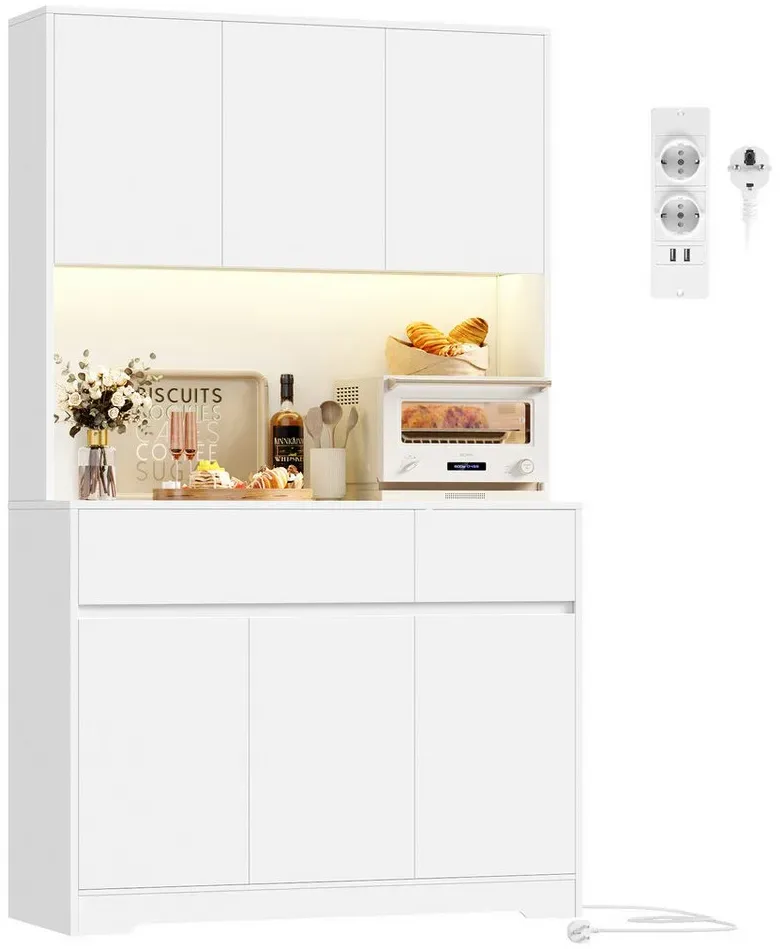 lieferbar-in 7-9 Werktagen bei dirHomfa Küchenbuffet Küchenschrank Buffetschrank mit LED-Beleuchtung mit steckdosen, Arbeitsplatte und verstellbare Ablagen, 100x38,5x180cm weiß
