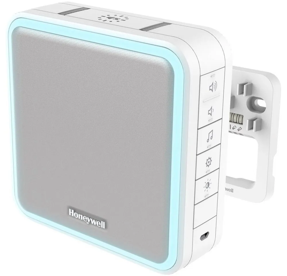 HONEYWELL HOME - EAN: 5004100965721 - Funk-Gong mit Repeater/Reichweitenverstärker und Verdrahtungsmodul, HALO-Lichtring und LED-Blitzlicht und Schlaf-/Stummmodus - WeißMit dem innovativen verdrahteten Funk-Gong DW915 von Honeywell verpassen Sie dank einer zuverlässigen Funk-Reichweite bis zu 200 m und einem Hörbereich bis zu 100 m nie wieder einen Besucher. Der Schlafmodus bringt den Funk-Gong für 3, 6, 9 oder 12 Stunden zum Schweigen, damit Sie sich frei von jeglicher Störung entspannen können. Der innovative HALO-Lichtring wird Sie auf die Anwesenheit eines Besuchers aufmerksam machen, wenn der Türgong nicht zu hören ist. Dank des eingebauten Repeaters/Funkverstärkers kann mit einem zweiten Funk-Gong die Funk-Reichweite auf bis zu 400 m erhöht werden. Bis zu Batterielebensdauer.Verpassen Sie nie wieder einen Besucher oder eine Lieferung - Verdrahten Sie Ihre vorhandenen Taster mit Ihrem drahtgebundenen Türgong und verpassen Sie dank der maximalen Lautstärke von 90 dB, die in bis zu 100 m Entfernung noch hörbar ist, nie wieder einen Besucher. Dank der Honeywell ActivLink -Technologie können Sie sogar einen zweiten Funk-Gong verlinken und diesen überall im Haus oder im Garten platzieren.Störungsfrei - Mit einstellbarer Lautstärke und innovativem Schlafmodus, der durch eine Stummschaltung das Klingeln für 3, 6, 9 oder 12 Stunden unterdrückt, können Sie und Ihre Familie während der Filmabende ungestört bleiben oder sich bei einem Nickerchen entspannen.Optische ... ![]() ![]()