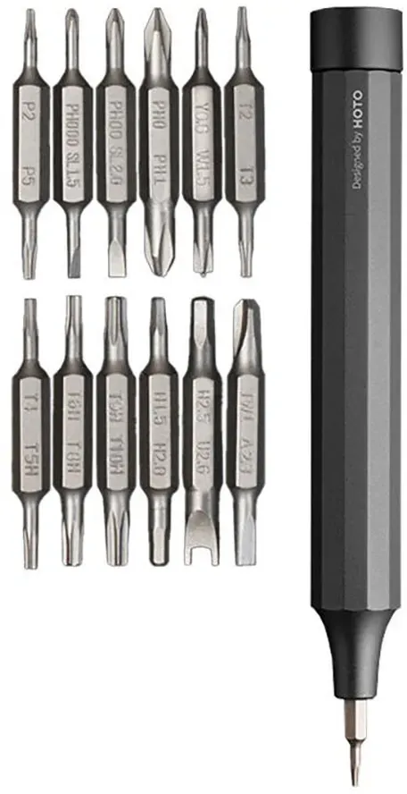HOTO - EAN: 6974370800314 - Dieser handliche Schraubendreher ist perfekt für kleine Reparaturen oder Heimwerkerarbeiten. Er besteht aus einer hochwertigen Aluminiumlegierung, ist sehr langlebig und bietet auch bei längerem Gebrauch einen hohen Bedienungskomfort.Das Set enthält 12 doppelseitige Bits (24 Arten), die du in einer magnetischen Box im Inneren des Schraubendrehers aufbewahren kannst.Handlich und funktionellDer HOTO QWLSD004 Präzisionsschraubendreher ist mit einer magnetischen Spitze ausgestattet, dank der du Bits bequem montieren und demontieren kannst. Außerdem liegt er dank seines ergonomischen Designs gut in der Hand und rutscht bei der Arbeit nicht herunter. Er ähnelt in seiner Größe einem Kugelschreiber und wiegt nur 100 g. Hast du Angst, deine Bits zu verlieren? Bewahre sie einfach in der magnetischen Box im Inneren des Schraubendrehers auf. Praktische Bits im SetDas Set enthält 12 doppelseitige Bits der 24 gängigsten Typen. Sie haben eine Härte von bis zu 60 HRC und sind aus hochwertigem S2-Stahl gefertigt. Sie sind daher langlebig und widerstandsfähig gegen mechanische Beschädigungen, Verschleiß und Rost. Sie eignen sich perfekt für die Reparatur von Uhren, Laptops, Spielzeug, Spielkonsolen, Drohnen und vielen anderen Geräten.Lieferumfang:Präzisionsschraubendreher (schwarz)12x umkehrbare C4 x 30 mm Bits (Schlitz: SL1.5 / SL2, Phillips: PH000 / PH00 / PH0 / PH1, Inbusbits: H1.5 / H2 / H2.5, Torx: T2 / T3 / T4 / T5 / T6 / T8 / T9 / T10, U-förmig: U2.6, ... ![]() ![]() HOTO QWLSD004 Bit-Schraubendreher