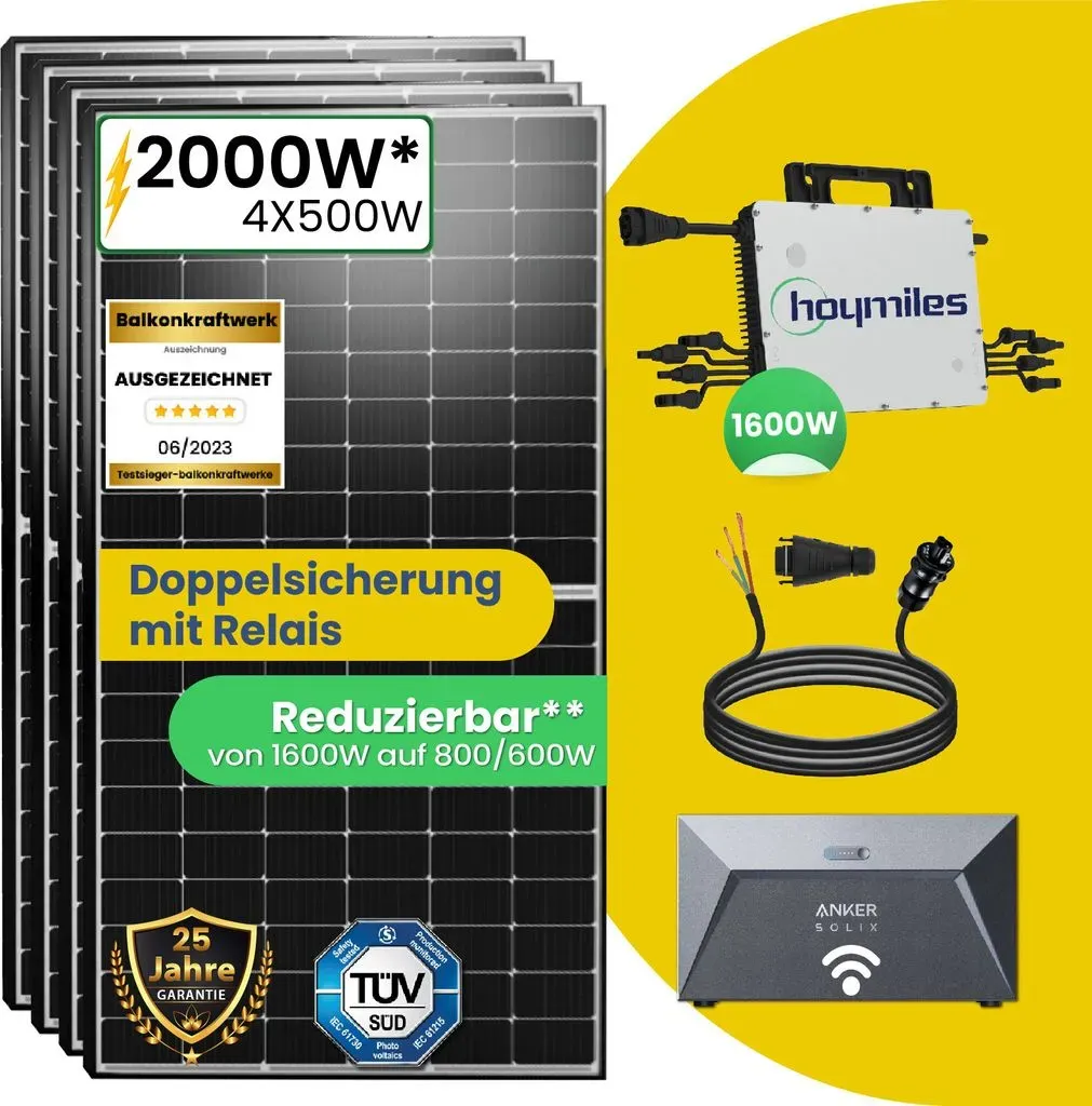 Kategorie: Stromspeicher - sunpro power - GTIN:4262450557947 - 2000W Balkonkraftwerk Set mit 4x500W Solarmodule, Hoymiles HMS-1600-4T Wechselrichter, Anker SOLIX Solarbank E1600 Solarspeicher und 5m WielandsteckerIhr Balkonkraftwerk für ZuhauseAuspacken, Aufbauen, Einstecken und Geld sparen! So einfach ist es mit der EPP Solar die Strom zu kürzen. Dieses Balkonkraftwerk ist eine effiziente und benutzerfreundliche Lösung zur Erzeugung von erneuerbarem Strom auf Ihrem Balkon.Warum unser Balkonkraftwerk?All-inklusive PaketeKinderleichter Aufbau- mit Hilfe von Bedienungsanleitungen und VideosReduzierbar von 1600W auf 800W/600W Lieferumfang4xEPP 500 Watt M10 HIEFF Twin Mono Schwarz / Silber Solarmodul (EPP-500W-S)1xHoymiles HMS-1600-4T Wechselrichter (HMS-1600)1x5 Meter + Wielandstecker und HMS Feldstecker (EPP-KBL-WLND-FS-5)1xAnker SOLIX Solarbank E1600 Solarspeicher (ANKER-BTR-1600)1 Paar3m MC4 Y Ausgangskabel2 PaareSolarpanel-Verlängerungskabel1xSchlüssel zum Entfernen von MC4-Steckern1xBenutzerhandbuch1x0W-AusgangsschalterHINWEIS: Die Lieferung kann möglicherweise in mehreren Paketen erfolgen. Entsprechend der Anzahl der Pakete erhalten Sie jeweils eine eigene Sendungsnummer.Komponenten im DetailEpp 500 Watt M10 HIEFF Twin Mono Schwarz / Silber SolarmodulDas Solarpanel ist vielfältig einsetzbar. Ob als Großanlage zur wirtschaftlichen Netzeinspeisung auf Ein- oder Mehrfamilienhäusern oder autarke Inselanlagen ohne Netzanschluss.Monokristalline Solarzellen zeichnen sich durch ... Das teuerste, aber auch umfassendste Set mit einem großen Speicher, ideal für maximale Unabhängigkeit und Energieeffizienz. Solarscout s.de 1600W Balkonkraftwerk Set (1820 Wp) - FULLBLACK - Hoymiles HMS-1600-4T 1-Phasig mit 2700Wh Anker SOLIX 3 E2700 Speicher