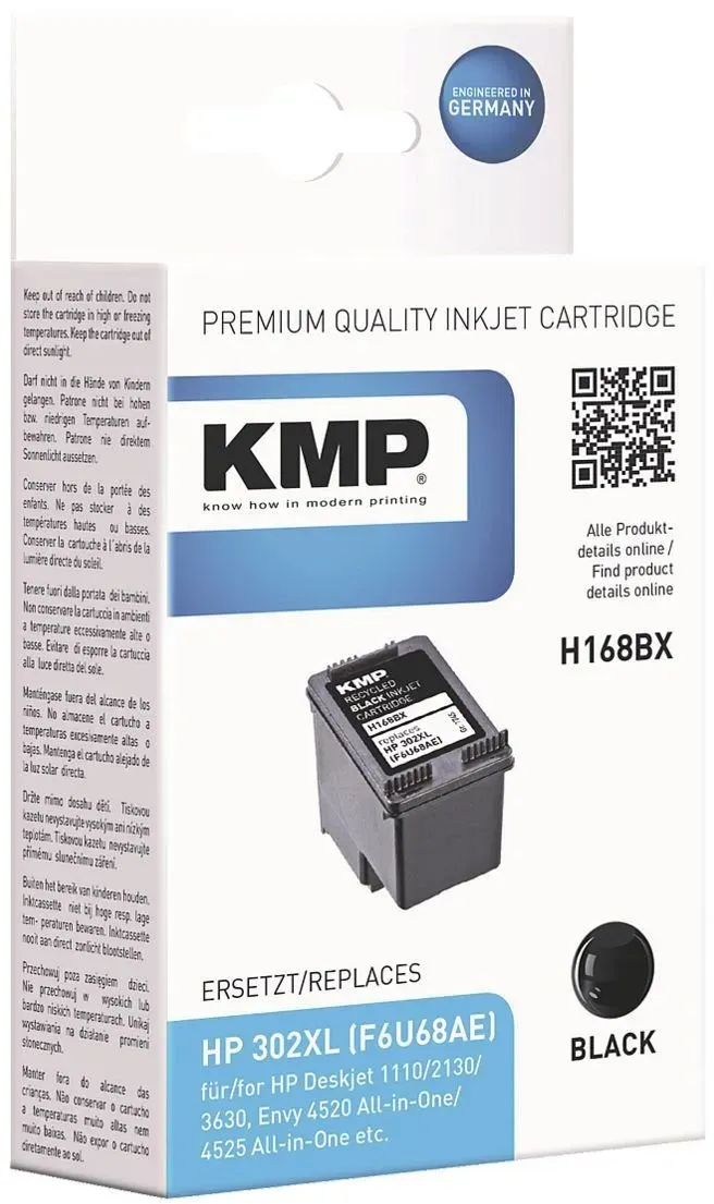 EAN: 4011324211122 - KMP Tintenpatrone HP 302XL. Original Hersteller Nummer: F6U68AE. Original oder Kompatibel: Kompatibel. Wiederaufgearbeitet: Ja. Seitenleistung: 550. Kompatibel: Deskjet 1110/2130/2132/2134/2136/3628/3630/3638/3639, Envy 4520 All-in-One/4525 All-in-One/4526 All-in-One, Officejet 3830/4650/4655/4656/5220/5230. Tintenmenge: 15 ml. Referenznummer der Patrone: H168BX. Gewicht: 58,4 g. Abmessungen: 110/140 x 75 x 37 mm (H x B x T). Farbe: Schwarz. - bei viking.de - aus Yadore Produktdaten Eine günstige kompatible Patrone von KMP, die eine gute Alternative zum Original darstellt. ![]() ![]() KMP H168BX kompatibel zu HP 302XL schwarz