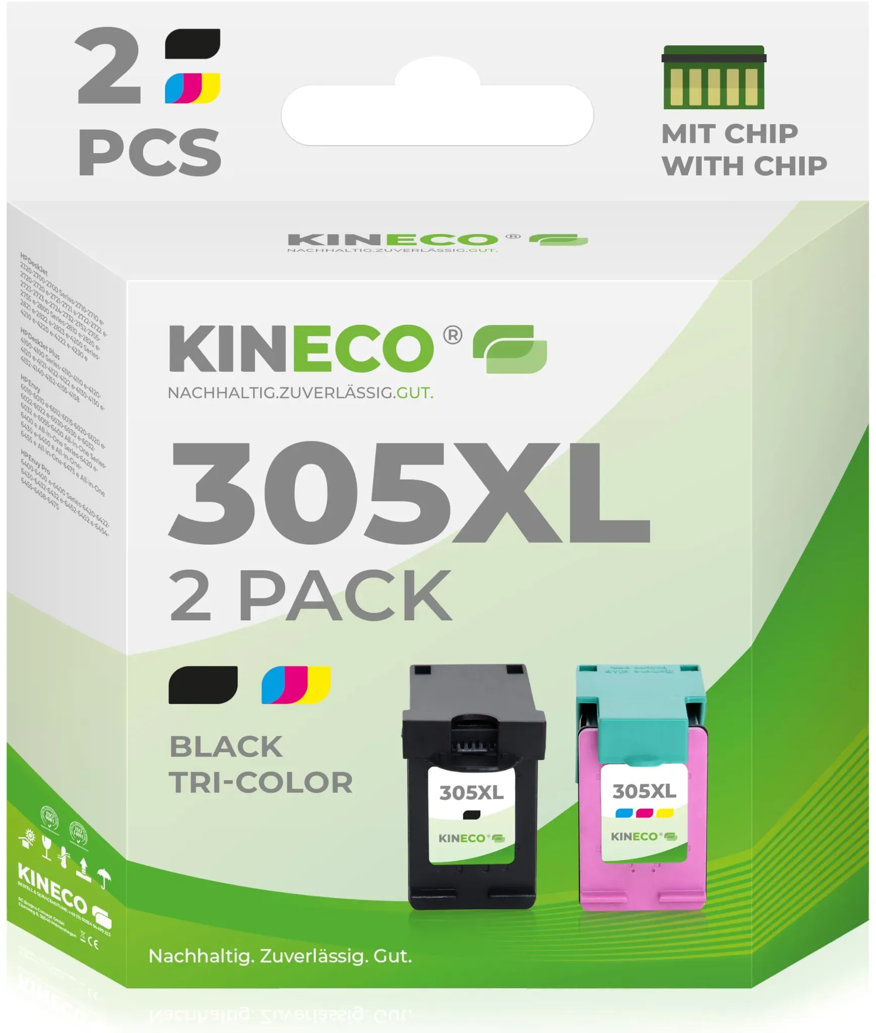 Kategorie: Druckerpatronen - Kineco - GTIN:4063667056694 - Extra hohe Reichweite Das Kineco 305 XL Multipack liefert eine deutlich längere Laufzeit als Standardpatronen, perfekt für umfangreiche Druckarbeiten. Breite Kompatibilität Entwickelt für eine Vielzahl von HP-Druckermodellen wie DeskJet 2700, 2710, 2720, DeskJet Plus 4100, 4120, Envy 6000, 6010, 6020 und Pro 6400. Problemlose Installation Die Patrone passt exakt, wird vom Gerät automatisch erkannt und gewährleistet eine reibungslose Nutzung wie bei Originalpatronen. Gleichbleibende Druckqualität Premium-Tinte sorgt für sauberen Textdruck und lebendige Farbergebnisse; Nutzer berichten von zuverlässiger Leistung und gut sichtbaren Farben. Nachhaltigkeit Unsere Produkte setzen auf umweltschonende Verpackungsmaterialien und ressourcenschonende Herstellungsverfahren, um Abfall zu minimieren und nachhaltige Standards zu fördern. - 29,65 Euro bei Amazon Marketplace CE - gefunden von billiger.de Das green gecko XXL Tinten Multipack ist eine kostengünstige Alternative mit hoher Füllmenge für Vieldrucker. ![]() ![]() green gecko XXL Tinten Multipack ersetzt HP 305 XL für HP DeskJet 2700 2710e 2720e 2720 2721e 2820e 2821e DeskJet Plus 4100 4110 4120 4130 Envy 6000 6010 6020 6030 e 6032 Pro 6400 6420 schwarz und farbig