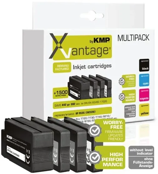 Tinte Kompatibel Inkjet-Kartuschen - EAN:4011324218763 - Eine hervorragende Wahl für Qualität zum günstigeren Preis - die KMP H166BX schwarz Druckerpatrone kompatibel zu HP 953XL (L0S70AE)Um interessante Informationen zu der KMP H166BX schwarz Druckerpatrone kompatibel zu HP 953XL (L0S70AE) zu erhalten, beispielsweise zur , lesen Sie einfach weiter!Druckleistung der KMP H166BX schwarz Druckerpatrone kompatibel zu HP 953XL (L0S70AE)Der Artikel verfügt über eine Druckleistung von ca. 2.300 Seiten (nach ISO/IEC 24711). Die Druckleistung ist eines der mitunter wichtigsten Kriterien beim Kauf. Sie gibt Auskunft darüber, wie lange Sie mit dem Produkt auskommen. Welcher Wert ist außerdem von Bedeutung? Die Füllmenge! Bei diesem Produkt liegt sie bei ca. 55,0 ml.Woher stammt das Produkt?Der Artikel gehört zur KMP€Familie. Die Marke begeistert unter anderem durch Produkte, die einem hohen Qualitätsanspruch entsprechen.Verlässlichkeit dank Nutzen Sie die KMP H166BX schwarz Druckerpatrone kompatibel zu HP 953XL (L0S70AE) mit gutem Gewissen, denn die Ihres Gerätes wird nicht beeinflusst. Sollte dennoch nachweislich ein Schaden am Gerät durch das Produkt von KMP entstehen, so übernimmt KMP die leistungen vom Original-Hersteller.Diese Alternative lohnt sichMit diesem Produkt erhalten Sie einen Refill-Artikel, d.h. von einem Drittanbieter gesäuberte und neu befüllte Ware. Solche wiederbefüllten Artikel sind der richtige Weg, falls Sie der Umwelt etwas Gutes tun wollen. Das liegt ... Dieses Viking Multipack ist eine sehr preiswerte kompatible Option für alle vier Farben. ![]() ![]() Viking 953XL Kompatibel HP Tintenpatrone 3HZ52AE Schwarz, Cyan, Magenta, Gelb Multipack 4 Stück