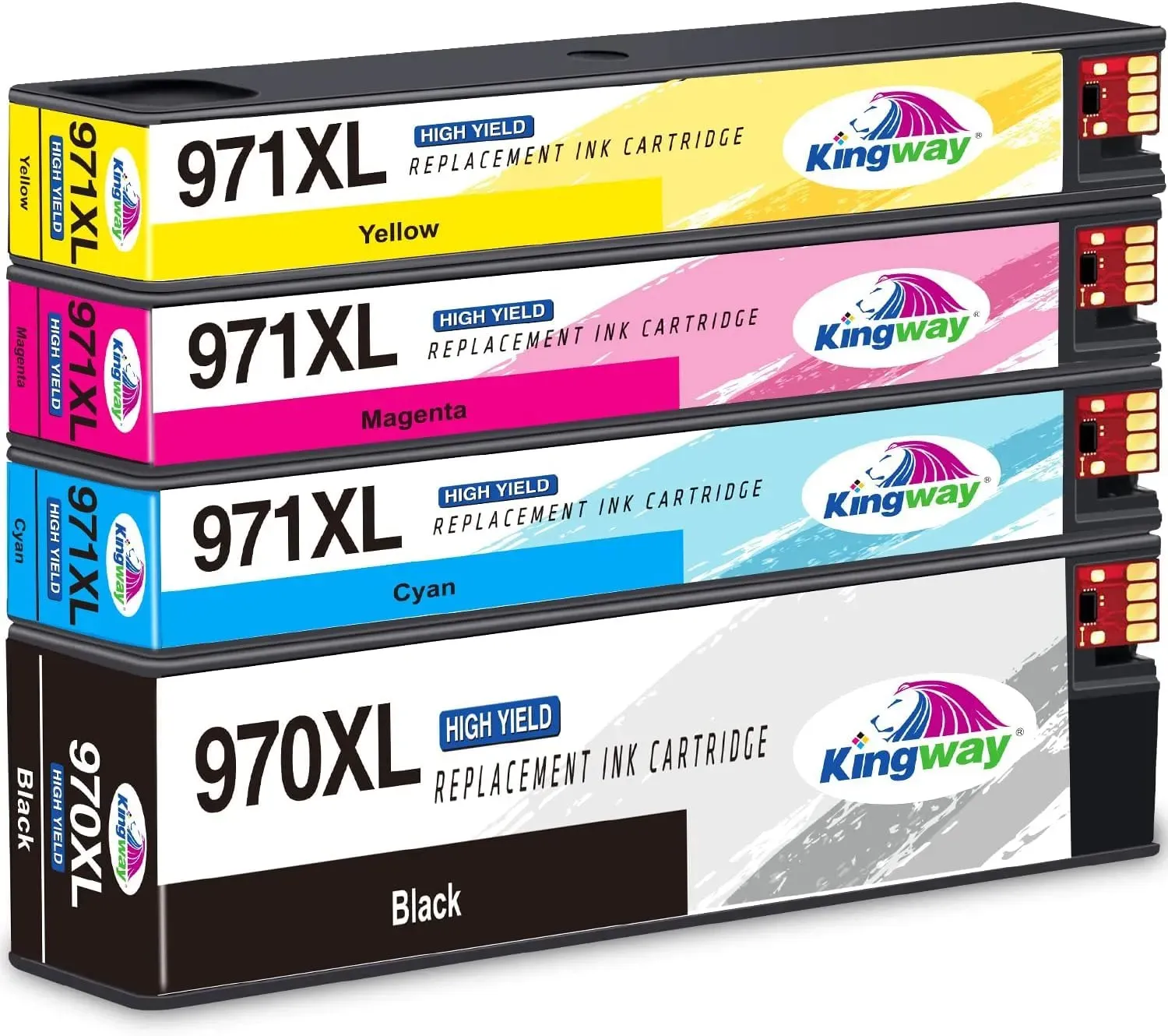 Kategorie: Druckerpatronen - OGOUGUAN - GTIN:9127942089267 - Lieferumfang 4 x Ersatzpatronen für HP 970XL 971XL Multipack (1 x 970XL Schwarz, 1 x 971XL Cyan, 1 x 971XL Magenta, 1 x 971XL Gelb, ) (nicht Original). Kompatibler Drucker : HP Officejet Pro X476dw, HP Officejet Pro X576dw, HP Officejet Pro X451dw, HP Officejet Pro X551dw Hohe Seitenleistung: ca. 9000 Seiten pro 970XL Schwarz Tintenpatronen, ca. 6200 Seiten pro 971XL Cyan/971XL Magenta /971XL Gelb Tintenpatronen (bei 5% Deckung von A4-Papier). Hohe Seitenleistung: ca. 9000 Seiten pro 970XL Schwarz Tintenpatronen, ca. 6200 Seiten pro 971XL Cyan/971XL Magenta /971XL Gelb Tintenpatronen (bei 5% Deckung von A4-Papier). Kingway 970XL 971XL-Tintenpatronen : 1 Die neuesten aktualisierten Chips ren eine hohe Kompatibilität, die entwickelt wurde, um beim ersten Mal und jedes Mal zu funktionieren. 2 Drucken Sie lebendige Farben, klaren und scharfen Text, satte und tiefe Schwarztöne, die Jahrzehnte halten. 3 Hohe Seitenleistung zur Reduzierung der Druckkosten, ideal für den täglichen Gebrauch zu einem Bruchteil des Originalpreises. Kaufen Sie mit Vertrauen : Jede Caidi 970XL 971XL Patrone ist einzeln vakuumversiegelt, vollständig in High-Tech-Anlagen getestet und unterliegt einer strengen Qualitätskontrolle, um alle Ihre Bedürfnisse zu erfüllen. Lebensdauer: 24 Monate. - 53,37 Euro bei Amazon Marketplace CE - gefunden von billiger.de Dieses 4er-Set kompatibler Patronen ist mit 57,90 Euro eine umfassende und preiswerte Lösung für alle Farben. ![]() ![]() SPS 4x Kompatibel HP 970XL 971XL Druckerpatronen Schwarz, Cyan, Magenta, Gelb für HP Officejet Pro X476