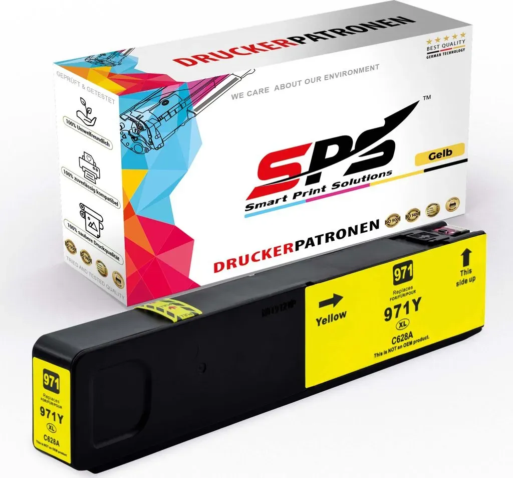 Kategorie: Druckerpatronen - uiprint - Kompatible Drucker: 100 % kompatibel mit HP OfficeJet Pro X451dw X476dw X576dw X551dw X476dn X451dn X476 X451 X551 X576 Packungsinhalt: 1 x Schwarz 970XL, 1 x Cyan 971XL, 1 x Magenta 971XL, 1 x Gelb 971XL Seitenausbeute: 9200 Seiten pro 970 XL Schwarz Druckerpatronen, 6500 Seiten pro 971 XL Farbe Druckerpatronen(5 % Deckung von A4). Vorteile: Kompatible Uiprint 970XL Tintenpatrone mit den neuesten aktualisierten Chips wird von der Druckerfirmware leicht erkannt. Hochwertige Tinte erzeugt hochwertige, lebendige und natürliche Drucke, die den Alltag und das Büro effizienter machen. Servicequalität 7 x 24 h: Wenn Sie Fragen zu dieser Patrone haben, können Sie uns jederzeit kontaktieren. Online-Kundenservice zur Lösung Ihrer Probleme, Ersatz oder Rückerstattung 1:1, wenn defekt. Automatische Rechnungsgenerierung. - 43,34 Euro bei Amazon Marketplace CE - gefunden von billiger.de Mit 46.19 Euro ist dies eine günstige kompatible Patrone von TonerPartner, einem bekannten Anbieter für Druckerzubehör. Tonerpartn er.de TonerPartner Kompatibel zu HP CN628AE / 971XL Tintenpatrone, gelb