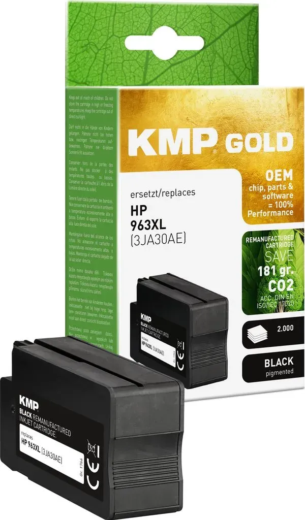 10 Händlerangebote bei billiger.de - Kategorie: Druckerpatronen - KMP - Entdecken Sie die neueste Innovation von KMP:KMP Gold Qualität, die glänztDie KMP Gold-Produkte bieten Ihnen 100 % Performance dank OEM-Parts und -Chips. Das bedeutet Premium-Druckqualität und volle Funktionalität wie bei neuen Patronen. Sie können sich auf ein sorgenfreies Druckerlebnis verlassen, da die KMP Patronen keine Probleme mit Firmware-Updates verursachen. Entscheiden Sie sich für KMP Gold und kombinieren Sie höchste Leistung mit einem wertvollen Beitrag zum Umweltschutz! KMP GOLD Tintenpatrone passend für HP 963XL Black (3JA30AE) mit OEM-Parts und ChipBei KMP gehen sie in Sachen Qualität und Leistung keine Kompromisse ein. Egal ob wiederaufbereitete Tintenpatrone oder clevere Neuentwicklung, das Ziel für ihre Produkte ist immer gleich: Für Ergebnisse wie beim Original, egal ob Brother, Canon, Epson, HP, Kyocera, Lexmark, Samsung und viele andere mehr.Ergebniss: Die Tintenpatronen von KMP passen perfekt, sind mindestens genauso farbintensiv und glänzen mit einem unschlagbaren Preisvorteil gegenüber den Tintenpatronen der Originalhersteller. Entscheiden Sie sich mit grünem Gewissen für KMP, dem Remanufacturer of the Year 2022, 2023 und 2024!Eigenschaften der KMP GOLD Tintenpatrone passend für HP 963XL Black (3JA30AE) mit OEM-Parts und Chip:OEM Nummer: 3JA30AEFarbe: BlackSeitenreichweite: Black 2000 Seiten DIN A4 (ISO/IEC 24711)Inhalt: 55 mlVorteile der KMP Tintenpatrone:Perfekte Passform und ... ![]() ![]()