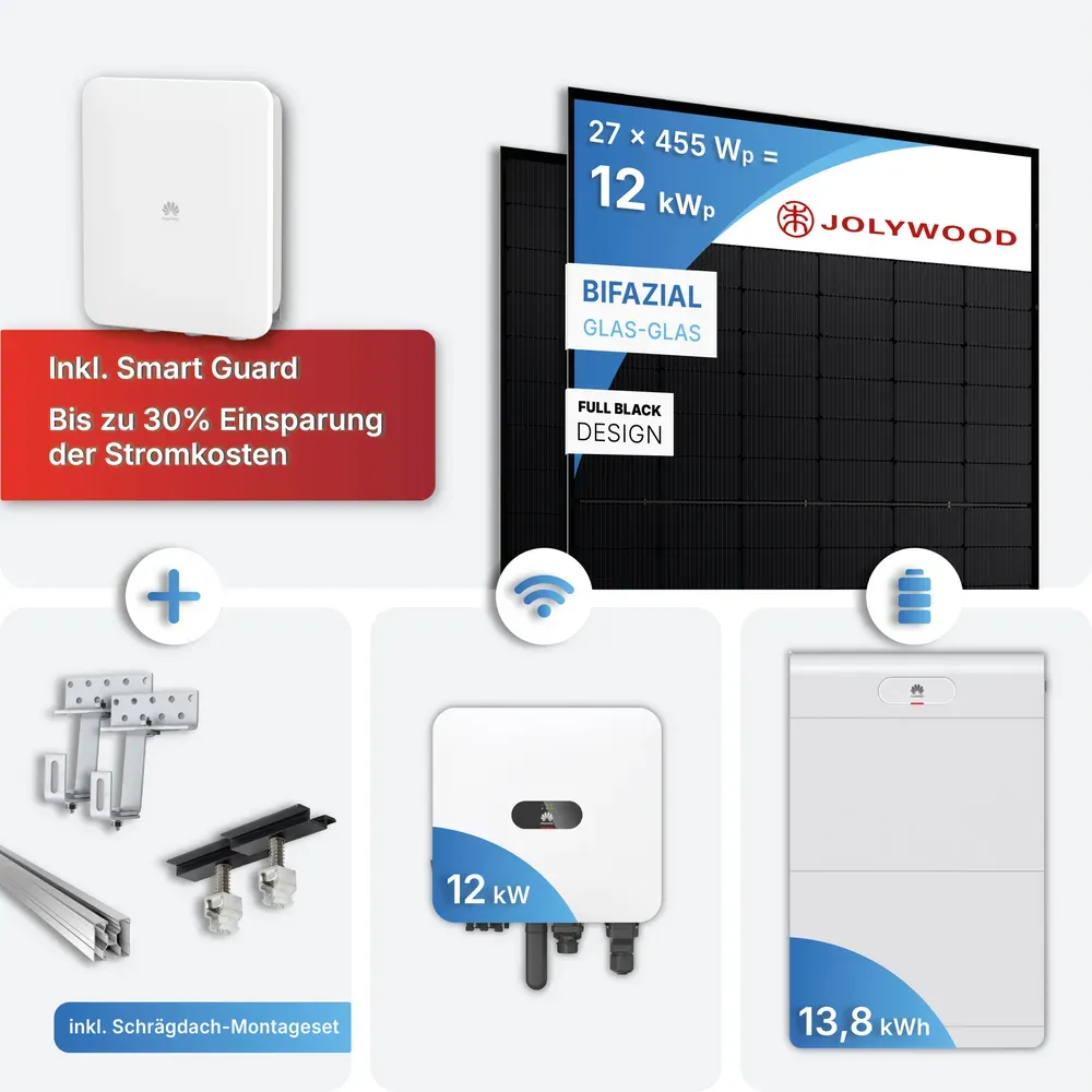 Kategorie: Solaranlagen - Huawei - Steigern Sie Ihre Energieunabhängigkeit mit unserer 12 kWp Photovoltaik-Komplettanlage von Huawei, ausgestattet mit den neuesten Huawei-Komponenten. Dieses Set kombiniert hochwertige bifaziale Full Black Glas-Glas Module, den innovativen Huawei SUN2000-12K-MAP0 Hybrid-Wechselrichter, den leistungsstarken Huawei LUNA2000-14-S1 Batteriespeicher und den neuen Huawei Smart Guard. Damit erhalten Sie nicht nur maximale Effizienz und Speicherfähigkeit, sondern auch höchste Sicherheit durch eine unterbrechungsfreie Notstromversorgung ein entscheidender Vorteil gegenüber herkömmlichen Komplettanlagen.Vorteil: Maximale Sicherheit mit Huawei Smart GuardDer Huawei Smart Guard ist weit mehr als eine Backup-Box. Er sorgt dafür, dass Ihr Zuhause oder Ihr Betrieb auch bei einem Stromausfall zuverlässig weiterläuft. Dank millisekundenschneller Umschaltung bemerken Sie den übergang kaum Licht, Kühlschrank oder Heizung bleiben in Betrieb. Gleichzeitig integriert Smart Guard das EMMA-System für intelligentes Lastmanagement: Wichtige Verbraucher werden automatisch priorisiert und der Energieeinsatz wird optimal an dynamische Stromtarife angepasst. Darüber hinaus lässt sich der Smart Guard nahtlos in Smart-Home-Systeme und SG-Ready-Wärmepumpen integrieren für ein zukunftssicheres Energieökosystem.Damit hebt sich dieses PV-Komplettset deutlich von Standardlösungen ab: Sie investieren nicht nur in eine Solaranlage, sondern in ein intelligentes Energiesystem mit ... Dieses Angebot für ein Huawei 14-S1 mit LUNA2000-14 HV-Speichersystem mit 27,6 kWh nutzbarer Kapazität ist ideal für Nutzer, die eine sehr hohe Speicherkapazität benötigen. ![]() ![]() Huawei 14-S1 mit LUNA2000-14 HV-Speichersystem, 27,6 kWh nutzbar, 3-phasig