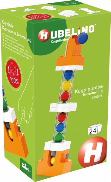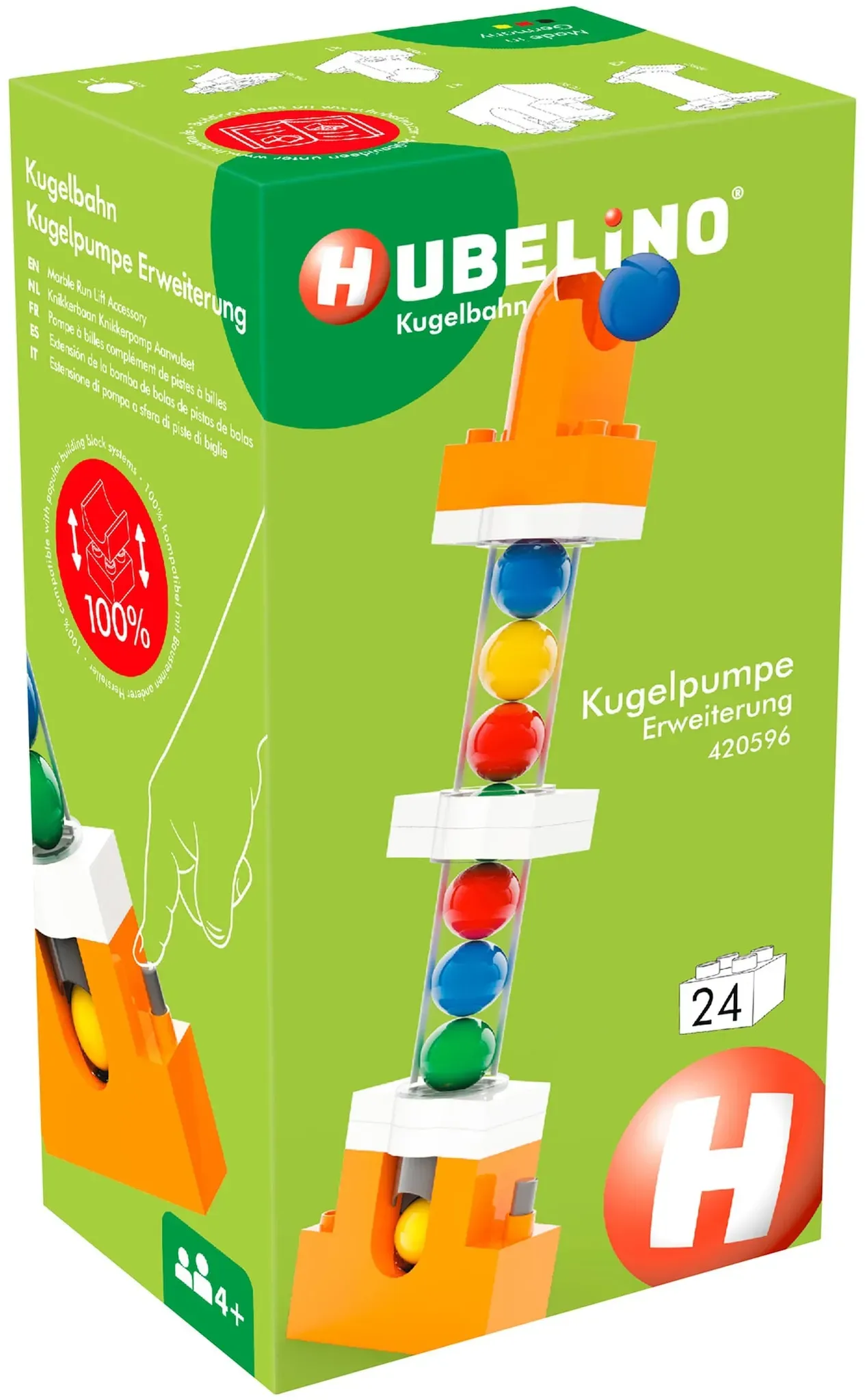 Hubelino - EAN: 4250331420596 - Die Kugelpumpe macht aus deiner Kugelbahn einen Kreislauf, der mit dem Pumpmechanismus gestartet werden kann. Das Sonderbauteil besteht aus der Pumpe selbst, einer Kugelführung, den Röhren und dem Kugelauslauf. Die Pumpe kann kinderleicht durch einen Knopfdruck betätigt werden, dabei wird die Kugel angehoben und von einer Sperrklinke fixiert. Die nächste Kugel drückt die vorherige eine Ebene weiter nach oben, sodass sich die Rohre immer weiter füllen bis die erste Kugel wieder oben in die Bahn startet. Die Pumpe kann in Kombination mit der drehbaren Kugelführung flexibel in die Bahn eingebaut werden und kann jeder Kugelbahn Konstruktion angepasst werden. Die Rohre sind jeweils 5 Bausteine hoch und durch das transparente Material kann man jederzeit sehen, wie viele Kugeln sich bereits darin befinden. Der Kugelauslauf gibt der Kugel anschließend den nötigen Schwung, um wieder in die Bahn zu starten. Neben der Kugelpumpe mit insgesamt drei Rohren beinhaltet das Set 18 bunte Kugeln.Alle Bauteile aus der 24-teiligen Kugelpumpe Erweiterung sind kompatibel mit gängigen Bausteinen anderer Hersteller und können dadurch kreativ mit deinen vorhandenen Bausteinen und Themenwelten kombiniert werden. Wie alle Produkte von Hubelino, wird auch die Kugelpumpe Erweiterung in Deutschland unter höchsten Qualitätsstandards gefertigt.100% kompatibel mit Bausteinen anderer HerstellerAlle Produkte von Hubelino passen perfekt zu den Bausteinen anderer bekannter - ... Dieses Angebot auf eBay ist eine der günstigsten Optionen für eine 24-teilige Kugelpumpen-Erweiterung. ![]() ![]() HUBELINO Kugelbahn - Kugelpumpe Erweiterung eBay (24-teilig)