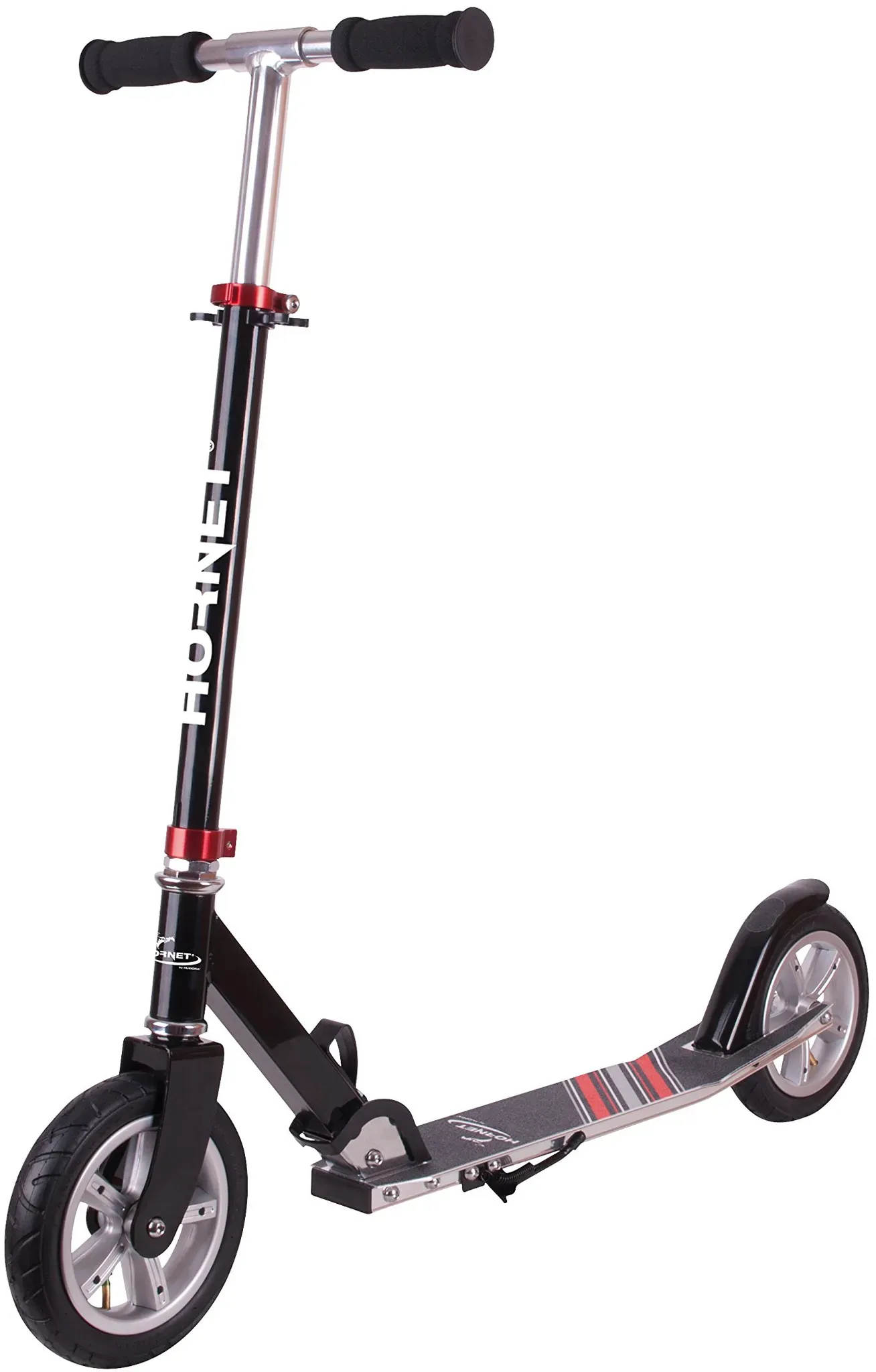 Kategorie: Kinderroller - Hudora - GTIN:0641702333036 - Cooler Hornet GS 200 Scooter mit Frontgabel, Lenker und Trittbrett aus hochwertigem Aluminium Gabel, Head Tube und Bremse des Scooters sind aus robustem Stahl Dank des umklappbaren, höhenjustierbarern Lenkers von 77 bis 102 cm kann der Scooter problemlos an die Größe des Fahrers angepasst werden Weitere Features des Scooter 200 sind die Hinterrad-Reibungsbremse, die für ein optimales Bremsverhalten sorgt sowie ein praktischer Ständer, hochwertige ABEC 5 Kugellager und die 200 mm PU-Rollen Der Hornet 200 Scooter ist ca. 87 cm lag und hat eine Trittfläche von ca. 10 x 31 cm; das max. Benutzergewicht beträgt 100 kg - 58,95 Euro bei Amazon Marketplace Sports - gefunden von billiger.de Dieser Scooter bietet ein gutes Preis-Leistungs-Verhältnis mit Luftreifen für eine komfortable Fahrt. ![]() ![]() Hudora Hornet Scooter Roller Air 200, schwarz/rot | Luftreifen Big Wheel | Tret-Roller luftbereift | Kick-Scooter | 14533