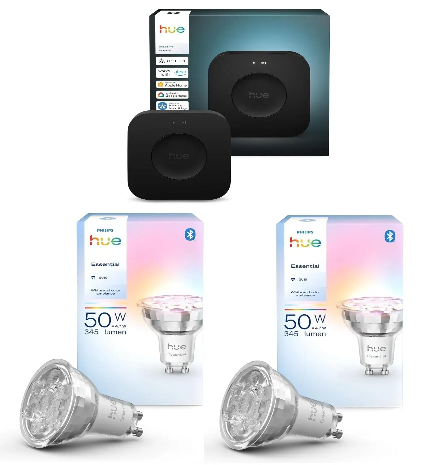 Kategorie: LED-Lampen - Philips - GTIN:5056847202010 - Paket enthält 2 Philips Hue 345 lm GU10 Smart-Leuchtmittel + Hue Bridge Pro-Hue 16 M Farben und warm-kühles Weiß, um die perfekte Stimmung oder das perfekte Ambiente zu schaffen Hue App: Schalter, dimmen, planen und individuelle Beleuchtungsroutinen erstellen Bridge Pro fügt Mehrraumsteuerung, Offline-Zuverlässigkeit und Smart-Home-Synchronisierung hinzu Einfache GU10-Installation mit langlebiger, energiesparender LED-Technologie - 139,97 Euro bei Amazon Marketplace Home - gefunden von billiger.de Dieses Bundle bietet die Hue Bridge Pro mit zwei E27 White & Color Ambiance Lampen zu einem attraktiven Preis. ![]() ![]() Philips Hue Bundle 2x White & Color Ambiance 806 A60 E27 Smart Lampen + Hue Bridge Pro | Smarte Beleuchtung, WLAN-Steuerung, kompatibel mit Alexa & Google Home