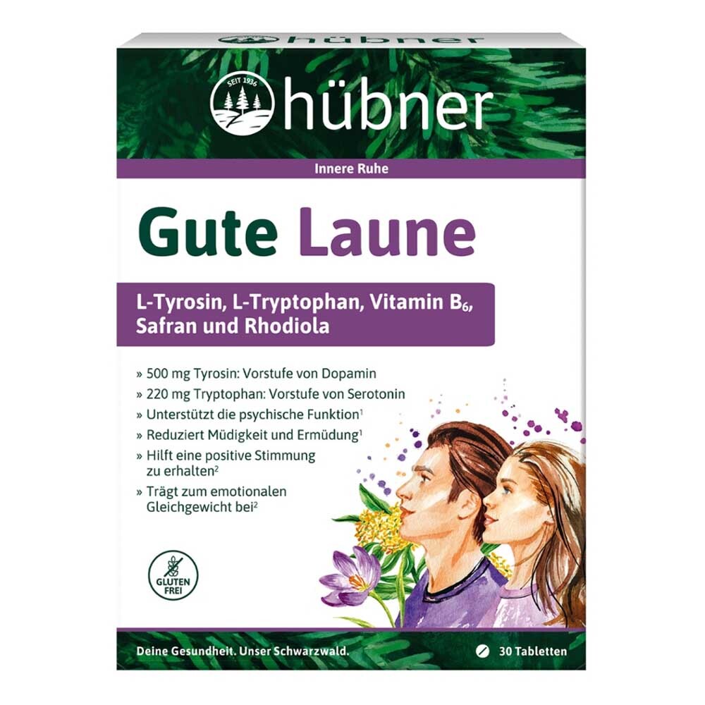 6 Händlerangebote bei billiger.de - Kategorie: Nahrungsergänzungsmittel - Hübner - ProduktübersichtHübner Gute Laune ist ein Nahrungsergänzungsmittel in Tablettenform (30 Stk., ca. 27 g), das gezielt auf psychische Ausgeglichenheit abzielt. Die Kombination hochwertiger Aminosäuren L?Tyrosin (500 mg) und L?Tryptophan (220 mg) ergänzt durch wertvolle Pflanzenextrakte aus Safran und Rhodiola sowie Vitamin B6, bietet eine innovative Formel, die klassische und moderne Aspekte vereint, um das emotionale Wohlbefinden zu unterstützen.Inhaltsstoffe & WirkmechanismenL?Tyrosin ist eine Vorstufe des Neurotransmitters Dopamin und kann zur normalen psychischen Funktion beitragen. L?Tryptophan dient als Baustein für Serotonin und kann positive Stimmungslagen fördern.Safran-Extrakt trägt im Rahmen zulässiger Health Claims zur Erhaltung des emotionalen Gleichgewichts bei. Rhodiola-Extrakt ergänzt die Rezeptur mit adaptogenen Eigenschaften. Vitamin B6 unterstützt den Energiestoffwechsel und trägt zur Verringerung von Müdigkeit und Ermüdung bei.Qualität & VerträglichkeitDas Produkt ist, gluten- und laktosefrei, frei von künstlichen Farbstoffen und Konservierungsstoffen. Deutschland unter strengen Qualitätsstandards, erfüllt es Anforderungen an Reinheit und Verträglichkeit auch bei sensiblen Anwendern.AnwendungsbereicheFördert psychische Funktion und unterstützt bei StimmungstiefsTrägt zur Verringerung von Müdigkeit und Ermüdung beiErmöglicht Erhalt emotionalen Gleichgewichts durch ... ![]() ![]() Hübner Gute Laune Tabletten (30St)
