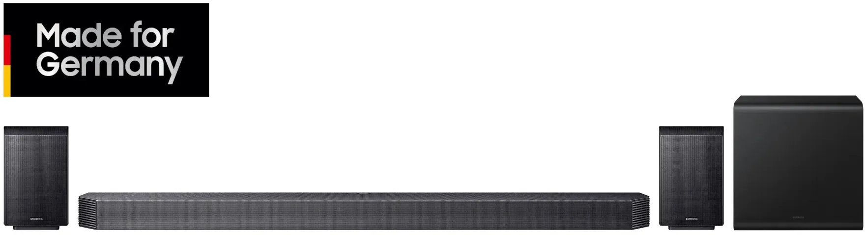 Kategorie: Surround-Systeme - Samsung - GTIN:8806097094036 - Kostenloser Streaming-Content: Dank Made for Germany kannst Du deine Lieblingsserien, Blockbuster oder Sport-Highlights in bestechender Bildqualität genießen ganz gleich, ob via Stream oder Satellit. Einfach Aktions-TV oder Aktions-Soundbar mit deutschem Modell-Code kaufen und kostenlosen Streaming-Content dazu erhalten. Samsung Soundbar mit kinoreifem 9.1.4-Kanal-Surround-Sound mit 17 integrierten Lautsprechern und kabellosem 6,5'-Subwoofer Surround-Sound-System mit nach oben abstrahlenden 2.0.2-Kanal-Rücklautsprechern für ein großartiges Heimkinogefühl Fantastischer 3D-Sound dank kabellosem Dolby Atmos und DTS:X Mit Q-Symphony zum perfekten Abstimmen von TV-Lautsprecher und Soundbar, SpaceFit Sound Pro für eindrucksvollen raumoptimierten Klang Lieferumfang: 1 x Samsung HW-Q935GF/ZG 9.1.4-Kanal Q-Soundbar für TV-Geräte, Bluetooth-Lautsprecher inkl. externem Subwoofer, Rücklautsprecher, Fernbedienung, Halterung für Wandmontage - 644,41 Euro bei Amazon Marketplace CE - gefunden von billiger.de Dieses Angebot direkt von Samsung DE bietet die Gewissheit, das Originalprodukt vom Hersteller zu erhalten. ![]() ![]() Samsung Q-Serie Soundbar HW-Q935GF 9.1.4-Kanal Subwoofer & Rücklautsprecher (2025) Black