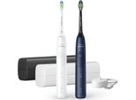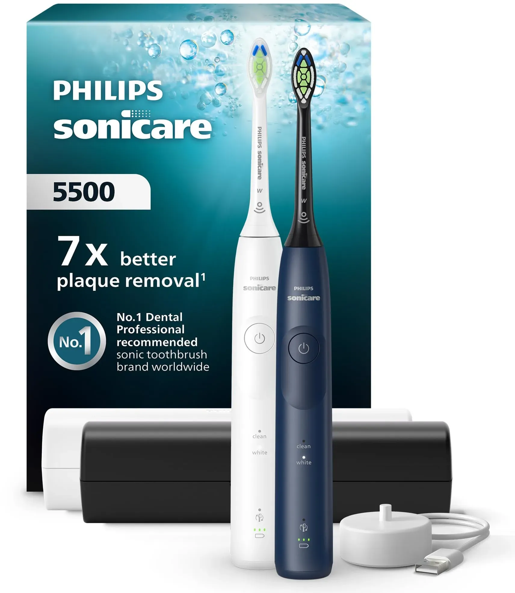 Auf Lager Versand durch AmazonPhilips Sonicare 5500 elektrische Zahnbürste, Sonic Zahnbürste mit 2 Putzmodi, Andruckkontrolle, EasyStart, SmarTimer und BrushPacer, Weiß und Navy, 2er-Pack, Modell HX7119/01 [Neue Technologie]