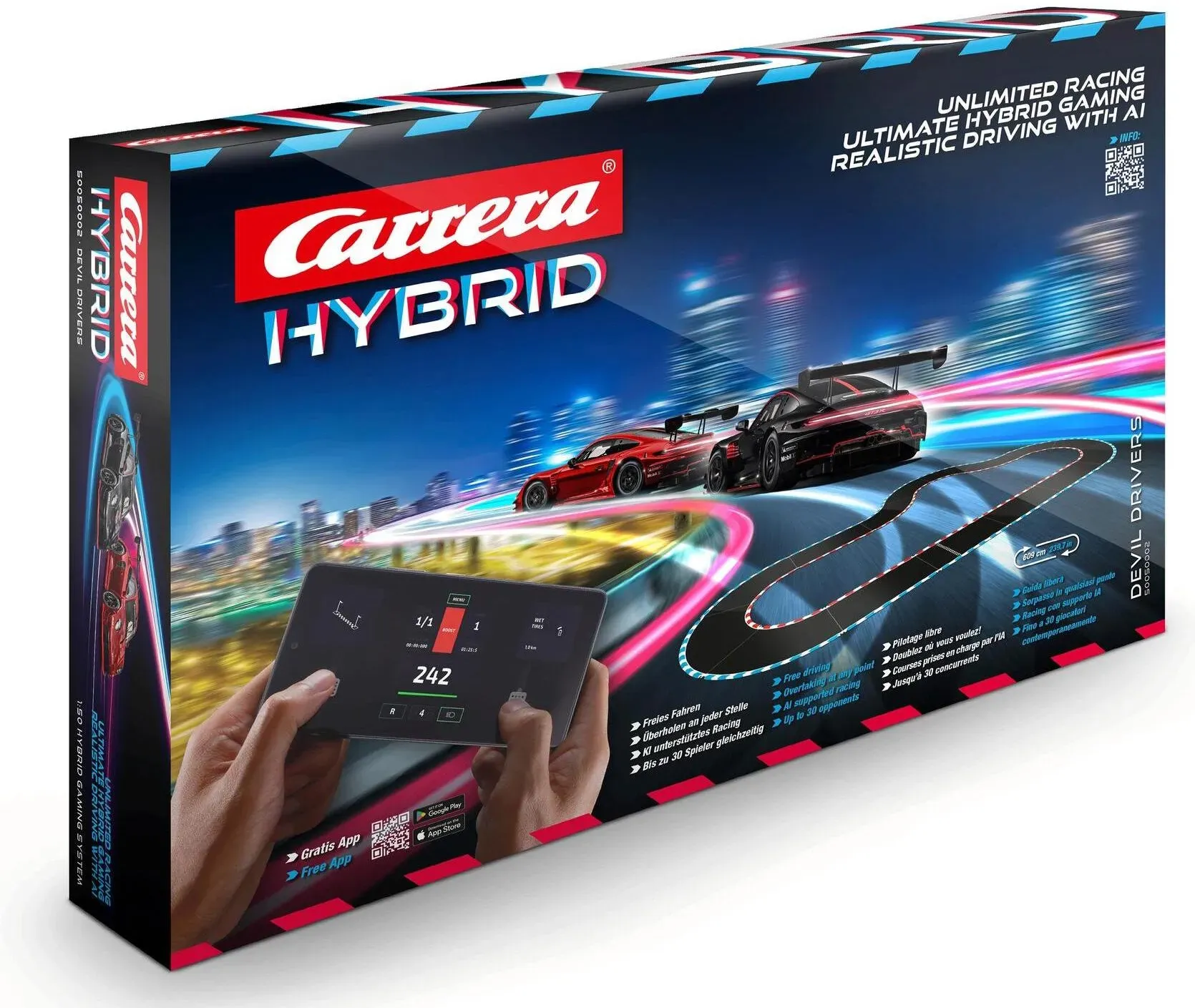 EAN: 9003150146469 - Erleben Sie den ferngesteuerten Carrera Hybrid Porsche 911 GT3 R 'Speed Yellow' im Maßstab 1:50 detailgetreu und voller beeindruckender Features. Das Fahrzeug besticht durch seine Front- und Rücklichter und kann sowohl auf der Carrera Hybrid Bahn als auch frei im Raum betrieben werden. Durch die maßstabsgetreu umgesetzten Fahreigenschaften fährt das Modell so realistisch wie das Original auf der Rennstrecke mit einem Top-Speed von bis zu 1,8m/s. Ein leistungsstarker Lithium-Akku ermöglicht bis zu 30 Minuten Rennspaß und ist in nur 20 Minuten mit einem USB-C-Kabel wieder aufgeladen. Dank der Mobile App-Steuerung, realistischem Motorsound und zahlreichen Anpassungsmöglichkeiten bietet dieses Modell das ultimative Fahrerlebnis für jeden Rennsport-Fan! - bei conrad.de - aus Yadore Produktdaten Das Carrera HYBRID Devil Drivers Set ist eine komplette Autorennbahn für spannende Rennen zu Hause. ![]() ![]() Carrera HYBRID Devil Drivers (50002)