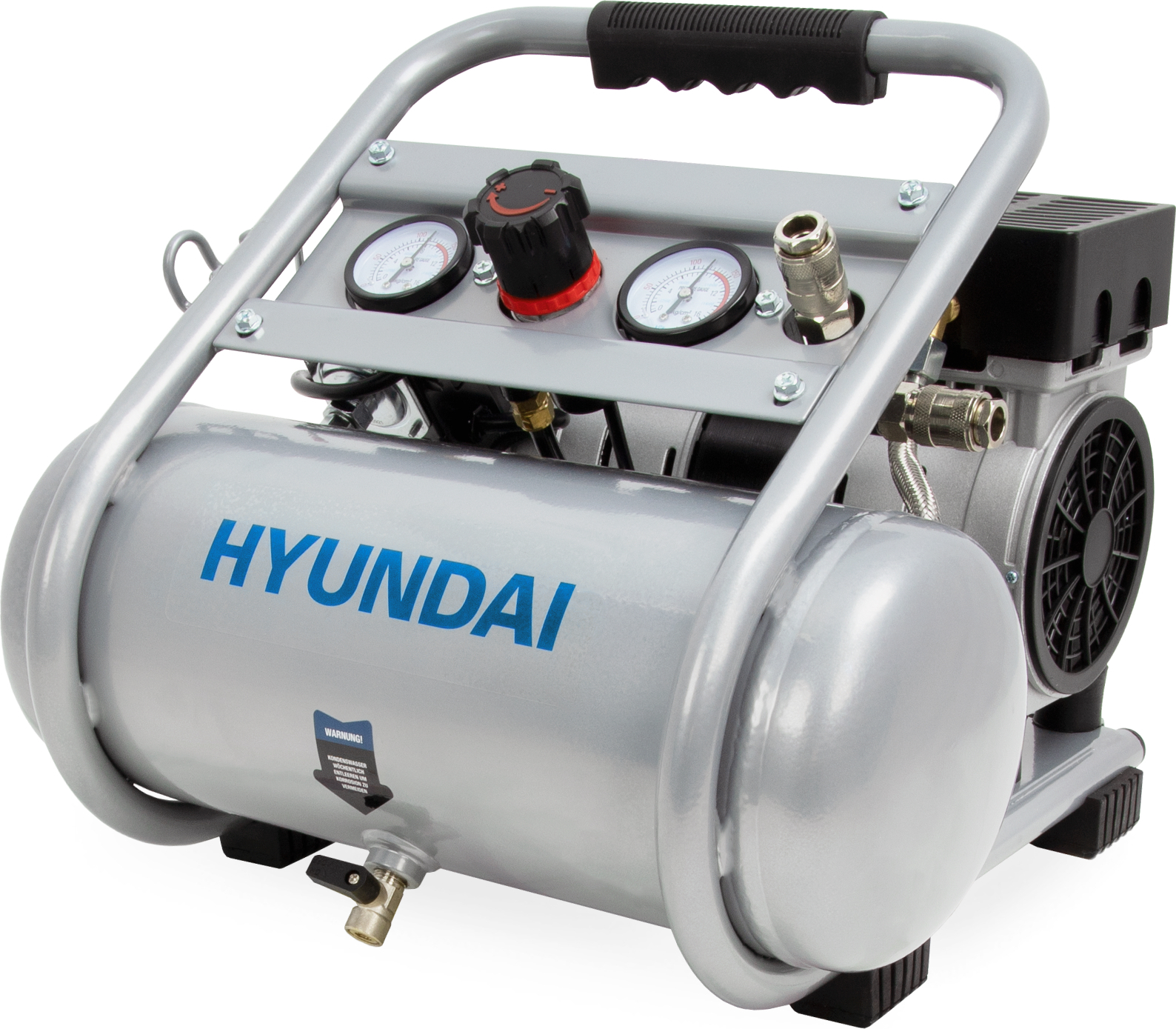 Kategorie: Kompressoren - Hyundai - GTIN:7640177165480 - Der HYUNDAI Silent Kompressor SAC75008IC überzeugt durch seinen äußerst leisen Betrieb, wodurch er sich ideal für den Einsatz in verschiedenen Bereichen wie Zuhause, im Labor, in der Garage oder in der Werkstatt eignet. Der robuste 8-Liter-Kessel des Kompressors ist innen und außen pulverbeschichtet, um Korrosion zu verhindern und stets saubere Druckluft bereitzustellen. Mit einem 0,75 kW (1 PS) starken Motor und einer Ansaugleistung von 128 Litern pro Minute bietet dieser Kompressor einen stabilen Druckbereich von 7 bis 9 bar, was ihn für diverse Anwendungen besonders flexibel einsetzbar macht. Egal, ob im anspruchsvollen oder privaten Gebrauch, er liefert stets die benötigte Leistung. Der öLFREIE Betrieb sorgt nicht nur für eine umweltfreundliche Nutzung, sondern senkt auch die Wartungskosten, da kein regelmäßiger ölwechsel notwendig ist. Zusätzlich ist der Kompressor mit praktischen Funktionen wie zwei Schnellkupplungen, einem Manometer und einem Druckminderer ausgestattet, die eine einfache und präzise Druckregulierung ermöglichen. Dank seiner kompakten Bauweise und dem nützlichen Tragegriff lässt sich der Kompressor mühelos transportieren und verstauen, was ihm eine hohe Flexibilität für den Einsatz an verschiedenen Orten verleiht. TECHNISCHE SPEZIFIKATIONMotorleistung: 0.55 kW (0.75 PS)Druckbehältervolumen: 8 LiterMax. Betriebsdruck: 9 barMax. Ansaugleistung: 128 L/MinAbgabeleistung bei 2 bar: 95 ... ![]() ![]() Kompressor Silent - Druckluft beschichtet eBay leise 0.75kW 9bar | HYUNDAI SAC75008IC