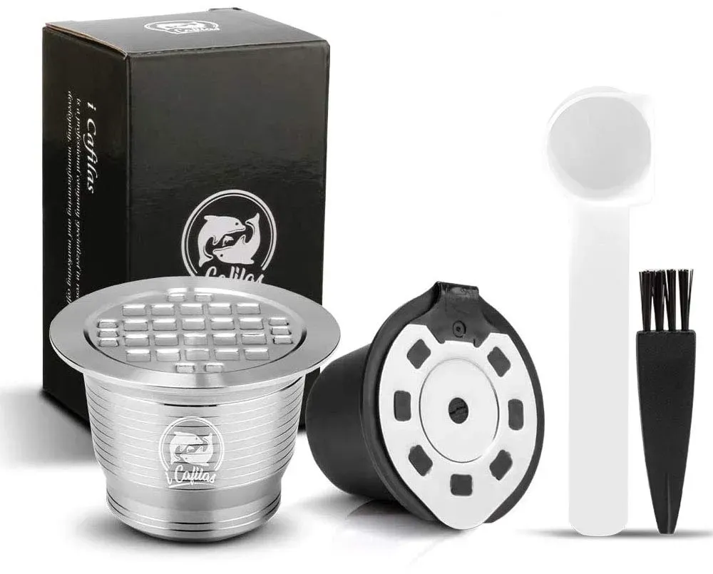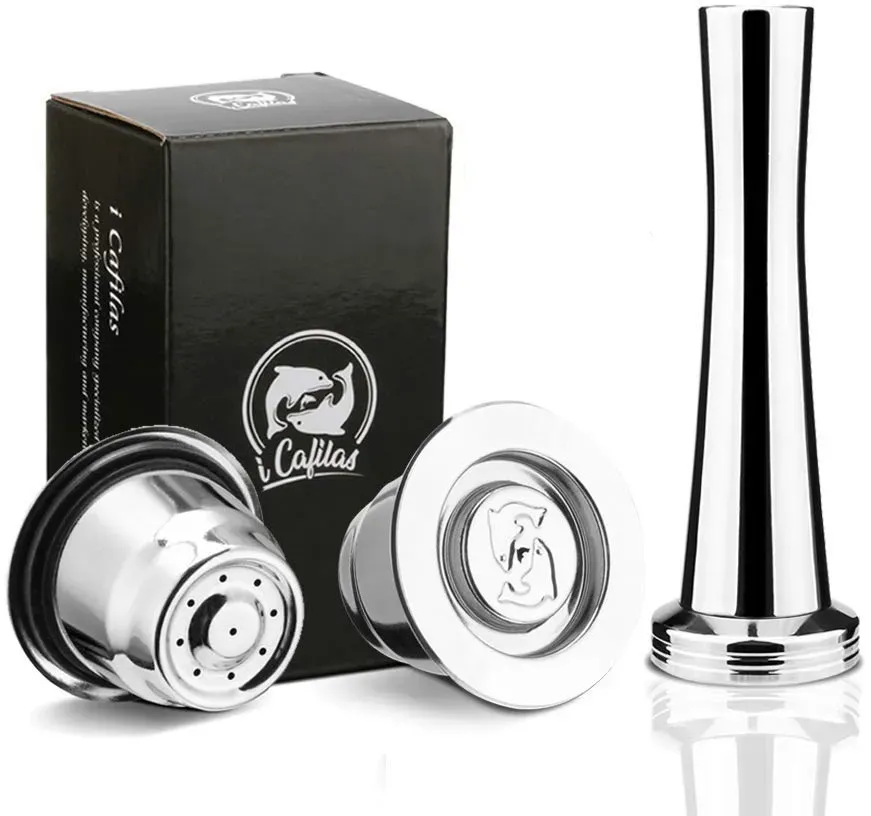 Auf Lager Versand durch Amazoni Cafilas wiederverwendbare nachfüllbare Espresso Kaffee-Kapseln für Nespresso (2 Stück) mit Kaffee Filter aus Edelstahl, kompatibel mit Nespressomaschinen, inklusive 1 Stampfer, 1 Löffel, 1 Bürs