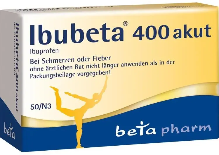 0,07 /Stück - Kategorie: Arzneimittel - Betapharm Arzneimittel GmbH - GTIN:4150162253335 - PZN:16225333 - Wirkstoff: Ibuprofen Anwendungsgebiete: Ibubeta 400 akut wird angewendet bei - leichten bis mäßig starken Schmerzen wie Kopfschmerzen, Zahnschmerzen, Regelschmerzen - Fieber. Ibubeta 400 akut enthält Natrium Dieses Arzneimittel enthält weniger als 1 mmol Natrium (23 mg) pro Filmtablette, d. h. es ist nahezu 'natriumfrei'. - 2,21 Euro bei medikamente-per-klick.de - gefunden von billiger.de Ein sehr preiswertes Angebot für 50 Filmtabletten von onfy.de. ![]() ![]() Betapharm Arzneimittel GmbH Ibubeta 400 Akut Filmtabletten 50 ST