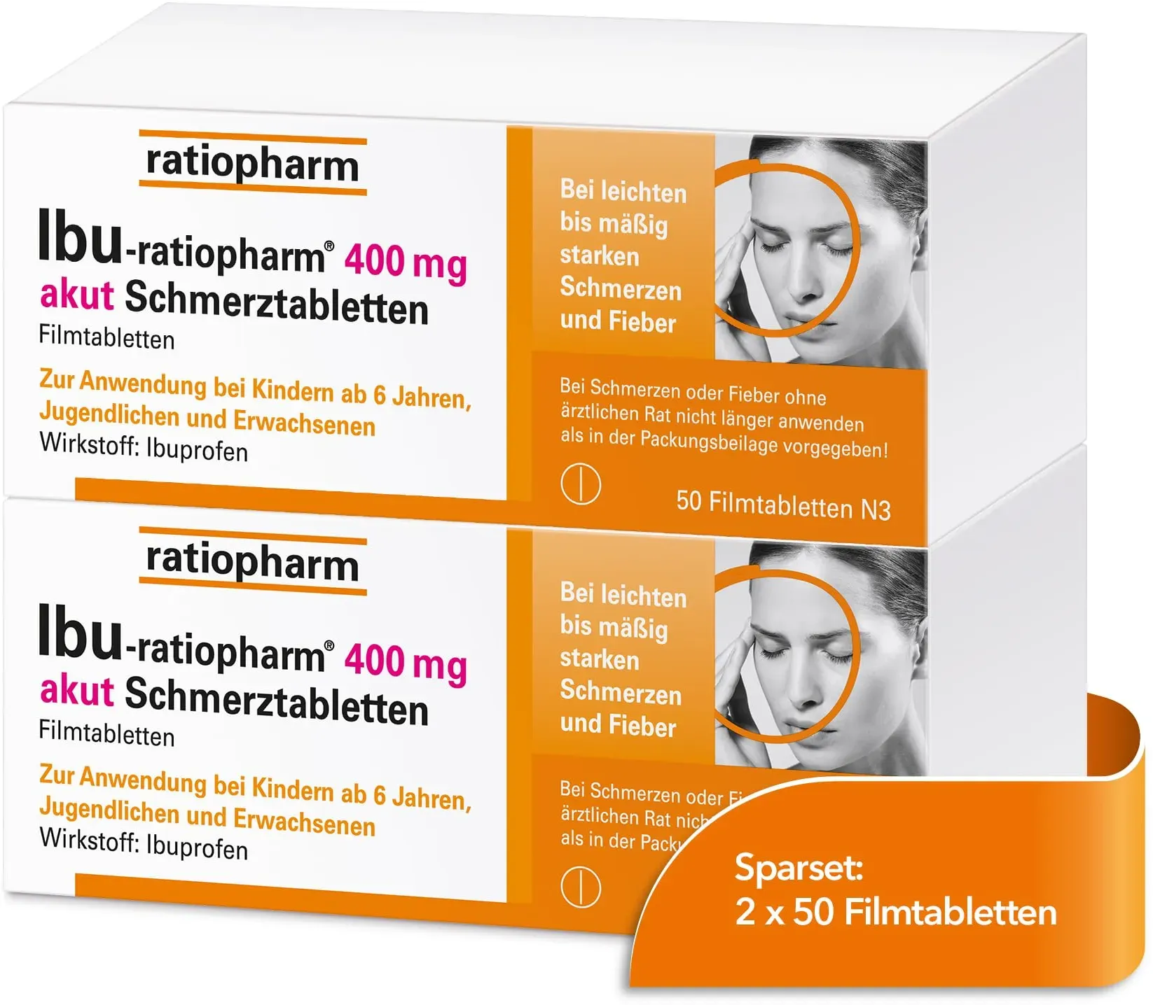 Verfügbarkeit: Lieferbar in 1-2 Werktagen - Kategorie: Arzneimittel - Ibuprofen - GTIN:4150035309510 - PZN:03530951 - Ibuprofen AL 400 Filmtabletten 50 St - 13,04 Euro bei medpex.de - gefunden von billiger.de Ibu-ratiopharm® 400 mg akut im Sparset (2x 50 Stk) bietet ein gutes Preis-Leistungs-Verhältnis für eine größere Menge zu 13.48 Euro. ![]() ![]() Ibu-ratiopharm® 400 mg akut Schmerztabletten im Sparset 2 x 50 Filmtabletten: Bewährt bei Schmerzen und Fieber. Wirkstoff: Ibuprofen